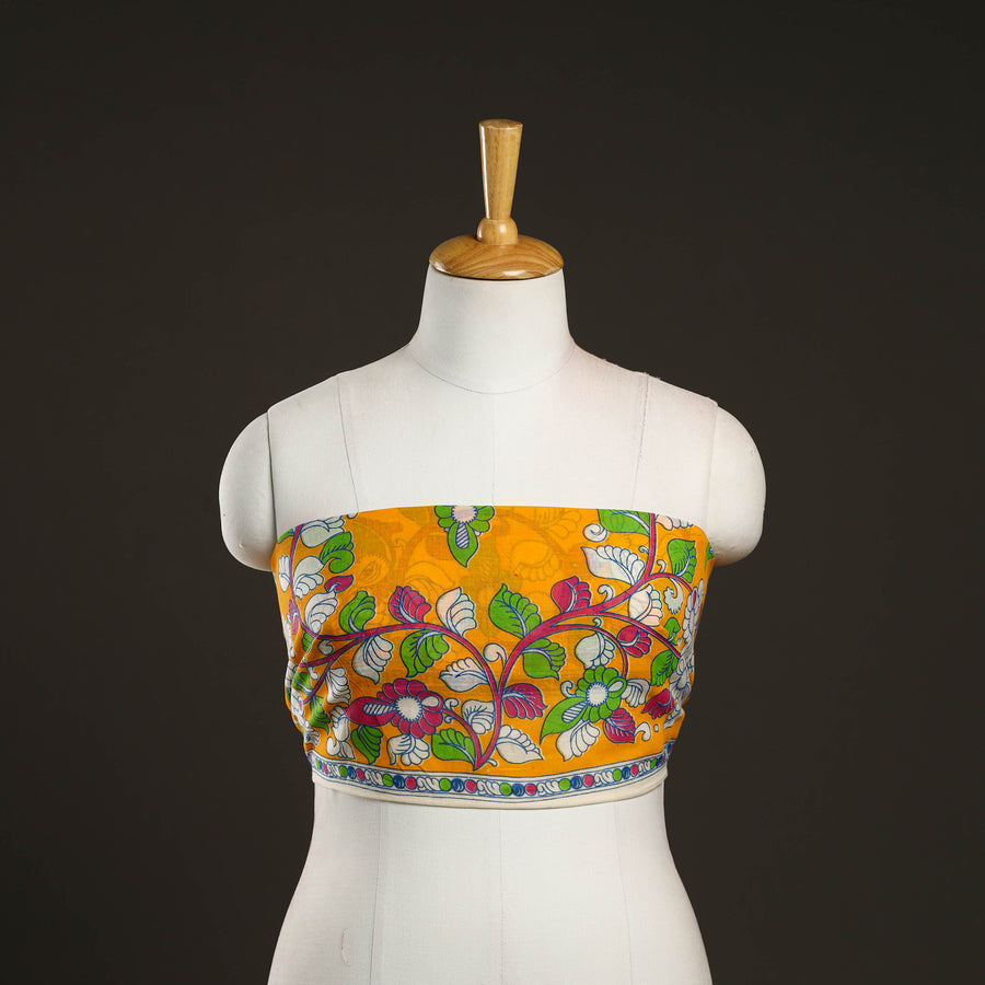 Cotton yellow kalamkari print blouse piece the breathable fabric ensures comfort and elegance. Perfect for pairing with sarees, this blouse piece reflects the artistic heritage of India while adding a timeless, charm to ethnic wear.