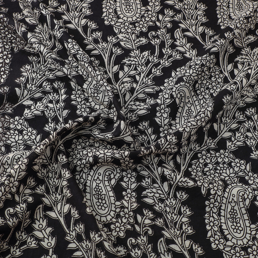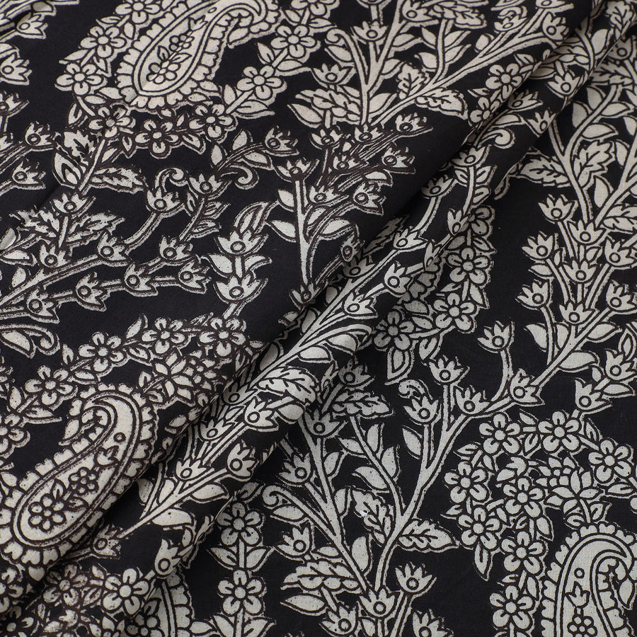 Cotton black kalamkari print fabric. Kalamkari is the earliest and more complex technique of printing showcases intricate screen-painted motifs on fabric. Soft yet durable, this versatile fabric is ideal for creating stylish apparel, unique home decor, or thoughtful gifts.