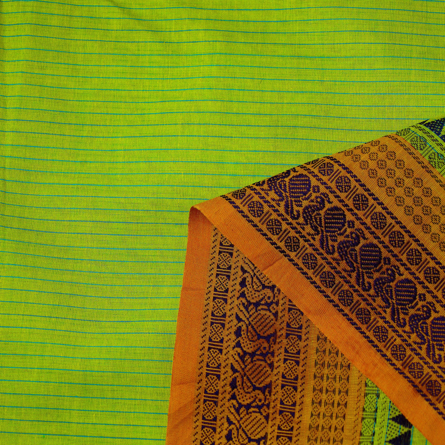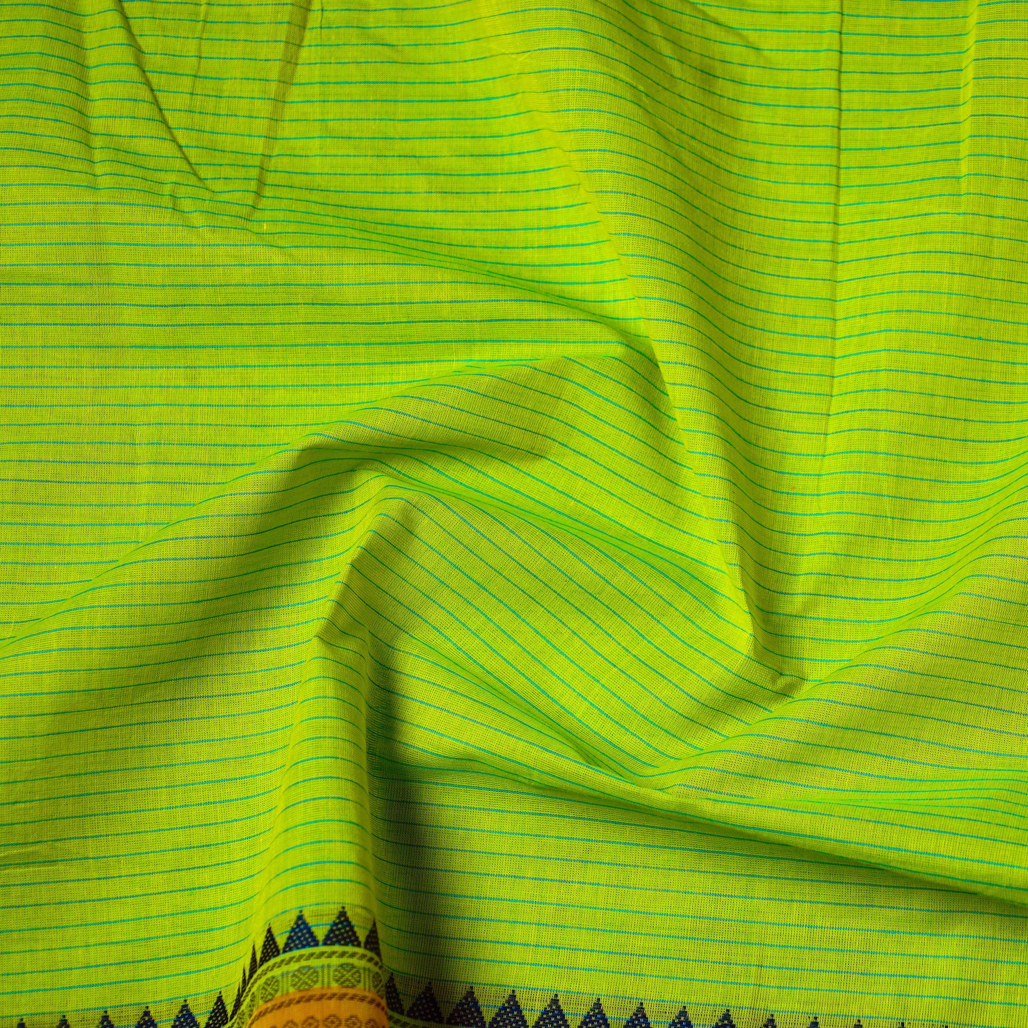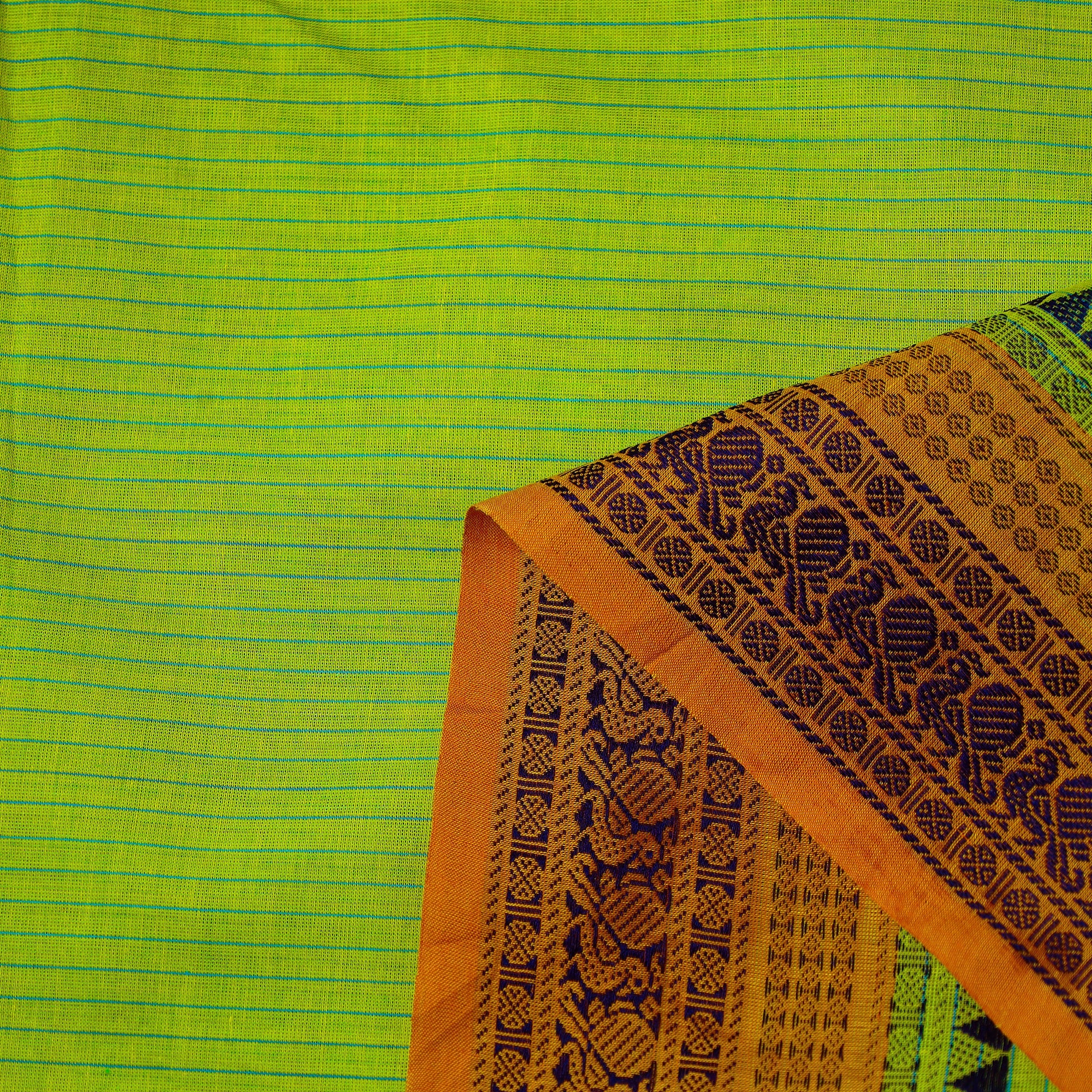 Fine quality cotton green kanchipuram fabric with thread border with thread border from , Tamil Nadu. Brilliantly woven fabric, kanchi cotton is the glory of the city of Kanchipuram in Tamil Nadu. Known as the Textile unit of the south, Kanchipuram has given to the world genuine and high quality fabrics. Ideal for sarees, kurtas, or home accents, its unmatched durability meets sustainable fashion.