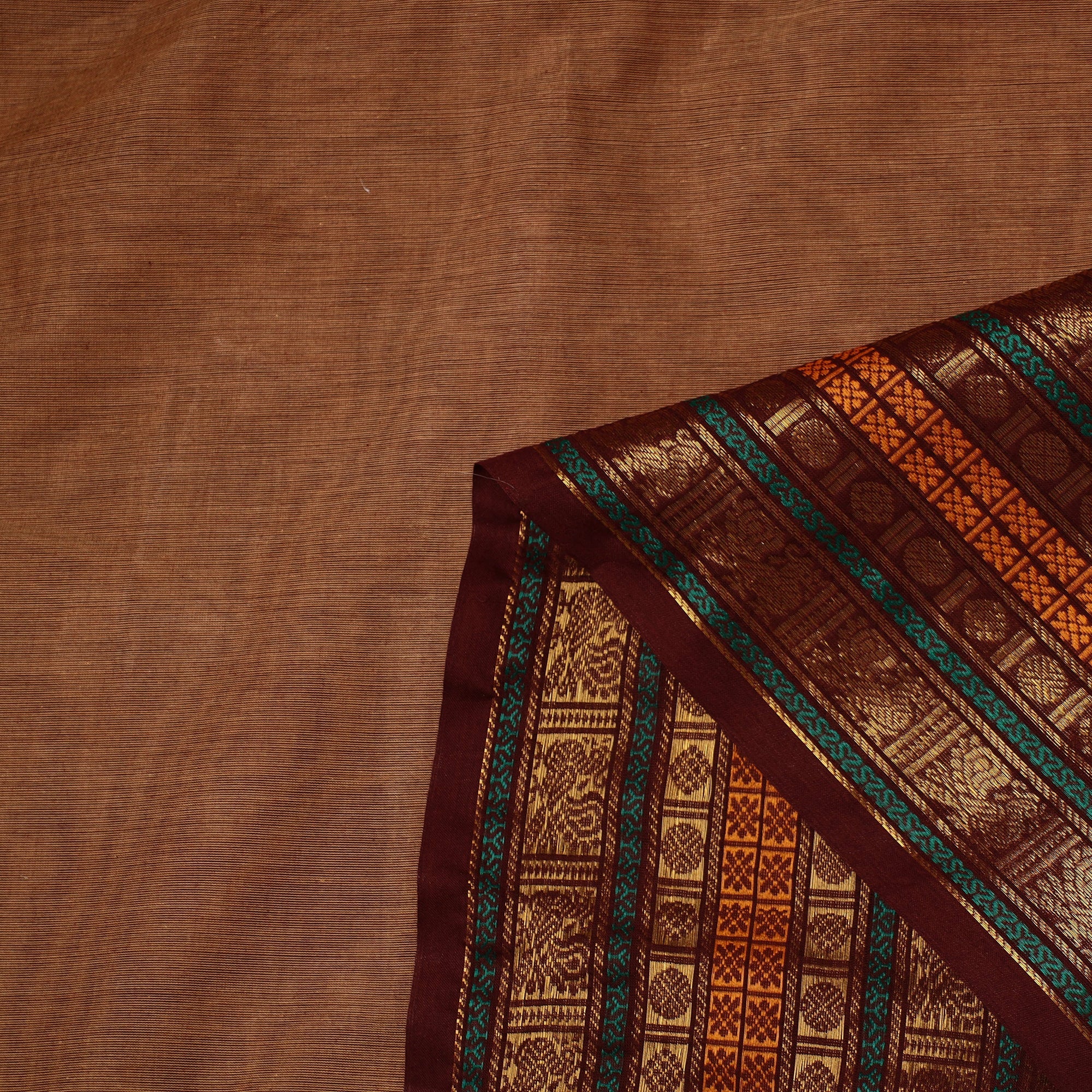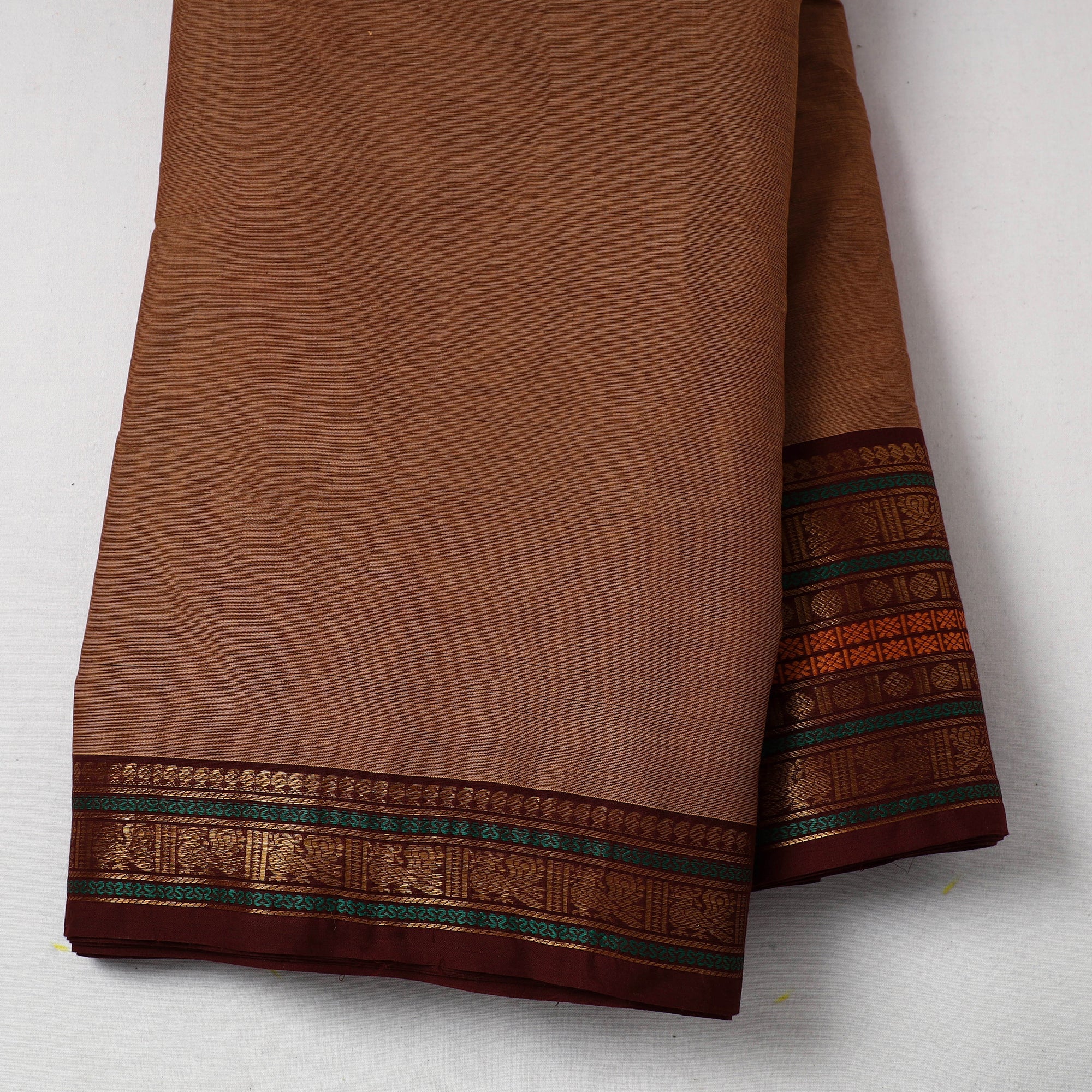 Tamil nadu weaving heritage with this brown cotton kanchipuram fabric with zari border. Featuring a soft texture and intricate zari border, it’s perfect for sarees, ethnic dresses, or modern attire. A blend of elegance and durability, this fabric reflects the timeless artistry of Kanchi while catering to today’s versatile fashion needs.