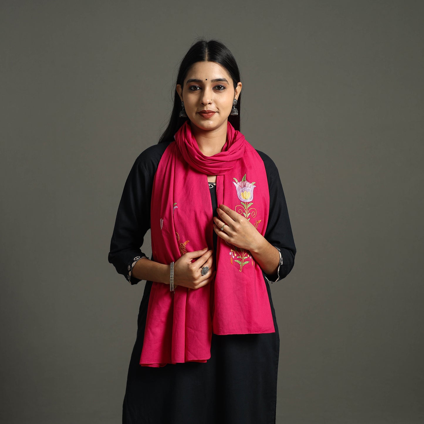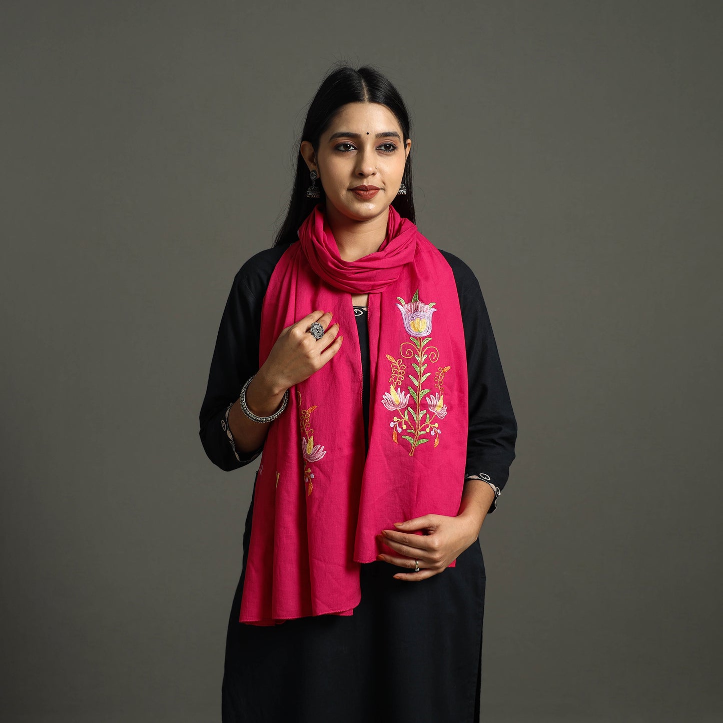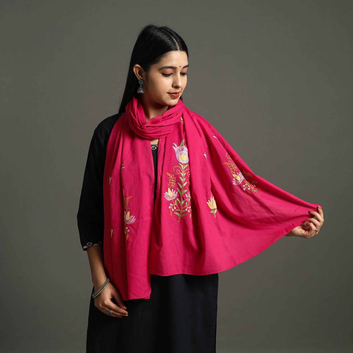 Add elegance to your outfits with this lightweight pink cotton kashida embroidery stole featuring intricate kashida embroidery crafted with multicolored threads. Inspired by nature it blends timeless design with everyday practicality. Perfect for casual or formal wear its breathable, sustainable, and easy to style.