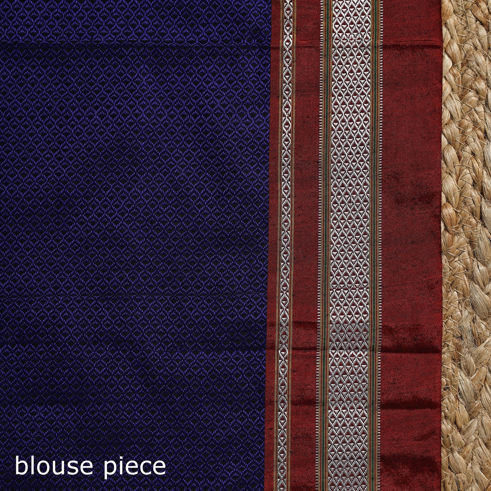 Khun is woven exclusively on a loom in Guledagudd, Bagalkot region, Karnataka. Used only for sari blouses, this handmade fabric is easily recognizable by its small white intricate motif and distinctive reddish-purple border.