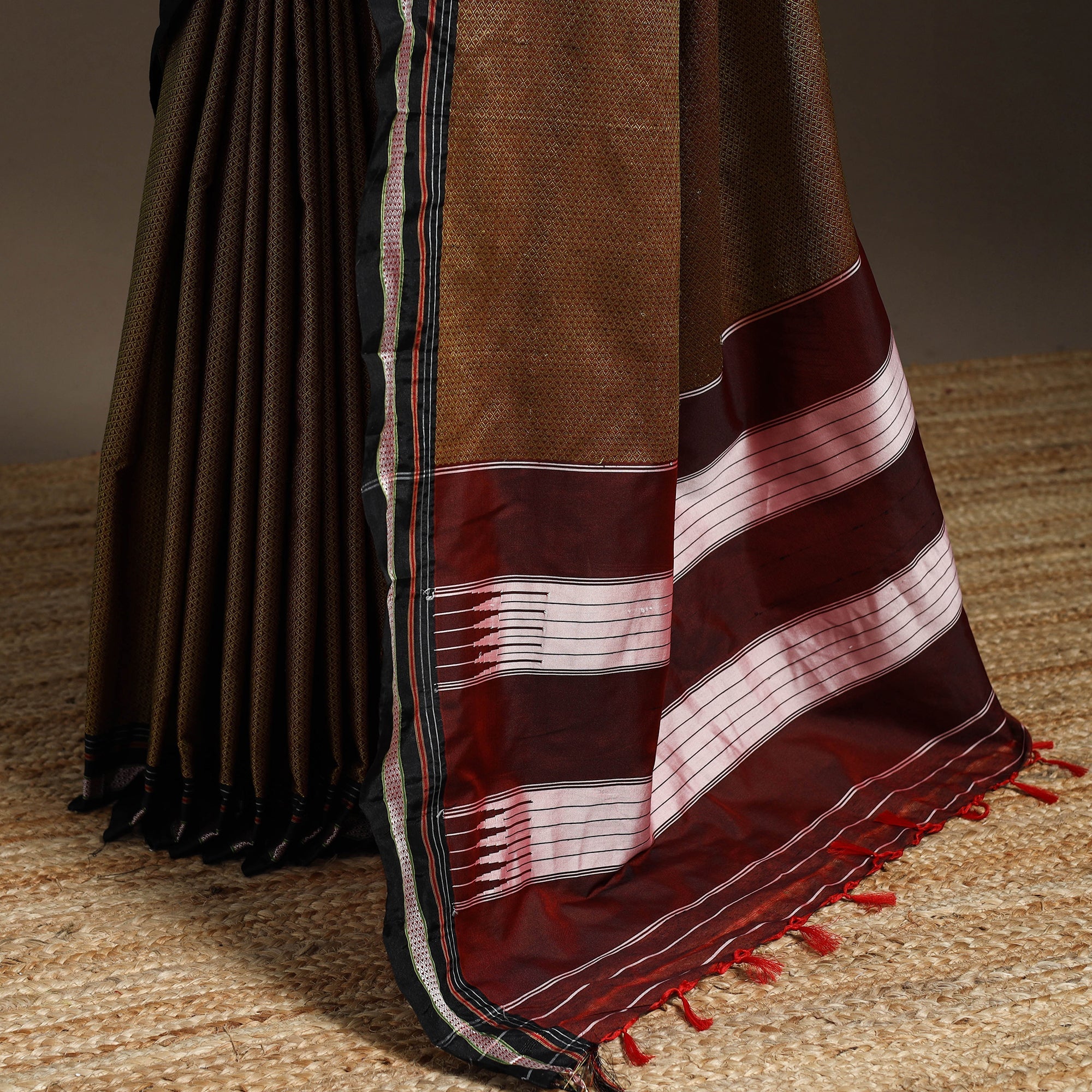 This beautiful brown khun saree from Karnataka blends tradition with modern charm. It features a soft cotton-nylon body and a vibrant poly-viscose pallu, finished with a chikki paras border. Khun sarees are now loved for their unique texture and colourful appeal perfect for festive occasions or elegant everyday wear.