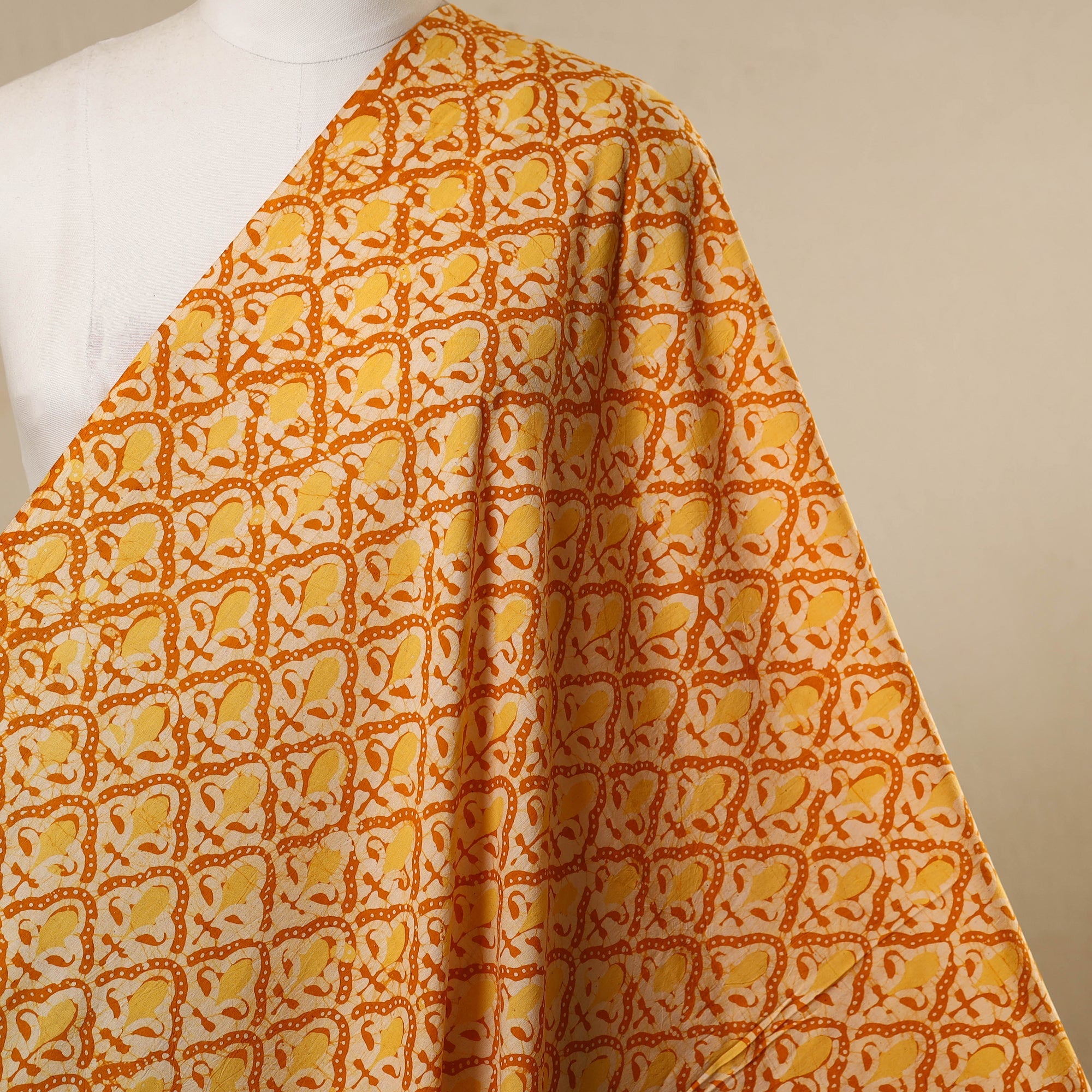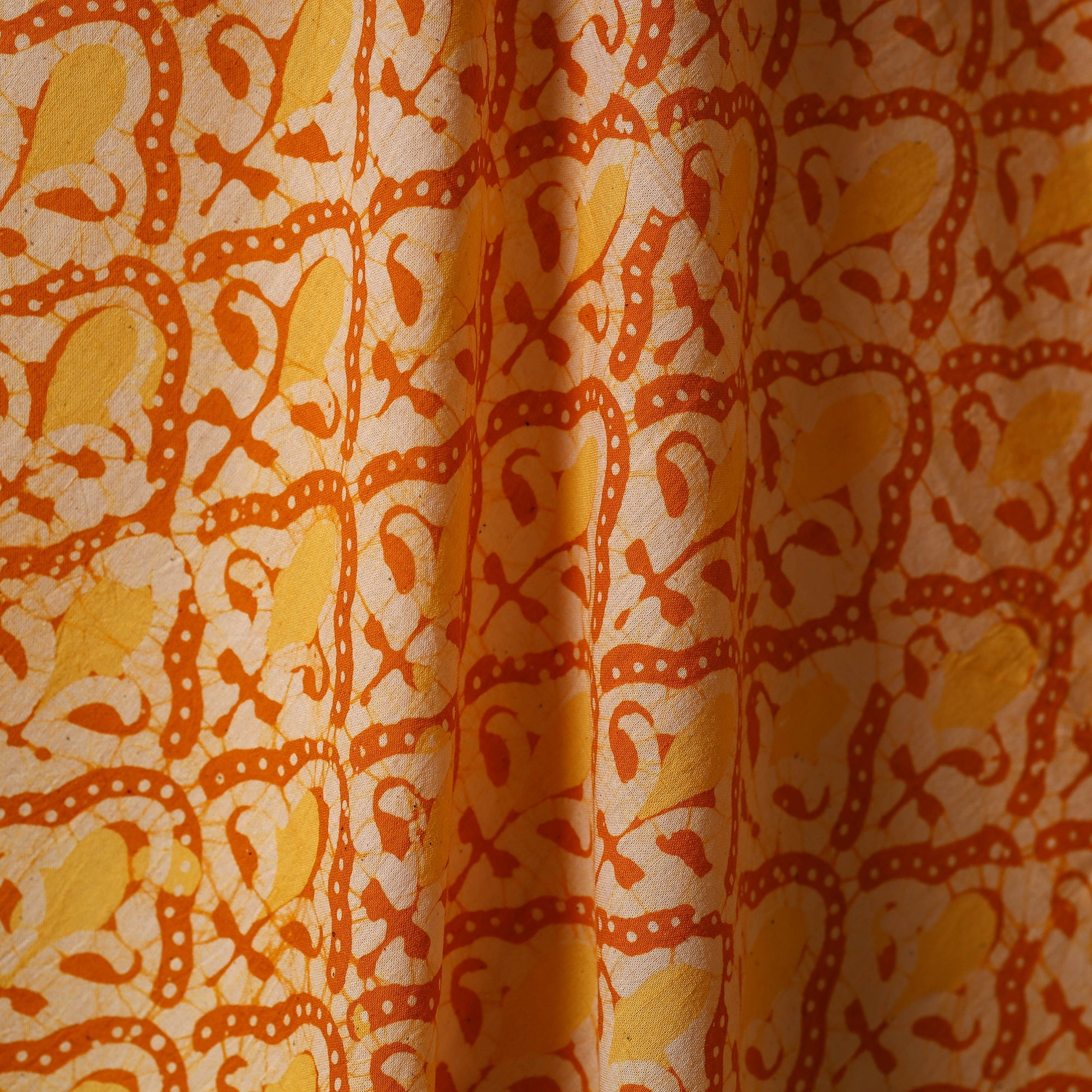 Elevate your creations with this yellow cotton batik print fabric, crafted by Shakil Ahmed Khatri from Kutch. Batik, the age-old wax-resist dyeing technique, lends the textile its layered textures and intricate motifs. Every yard reflects the heritage of Indian artisans, making it an ideal choice for distinctive apparel or elegant home décor projects.