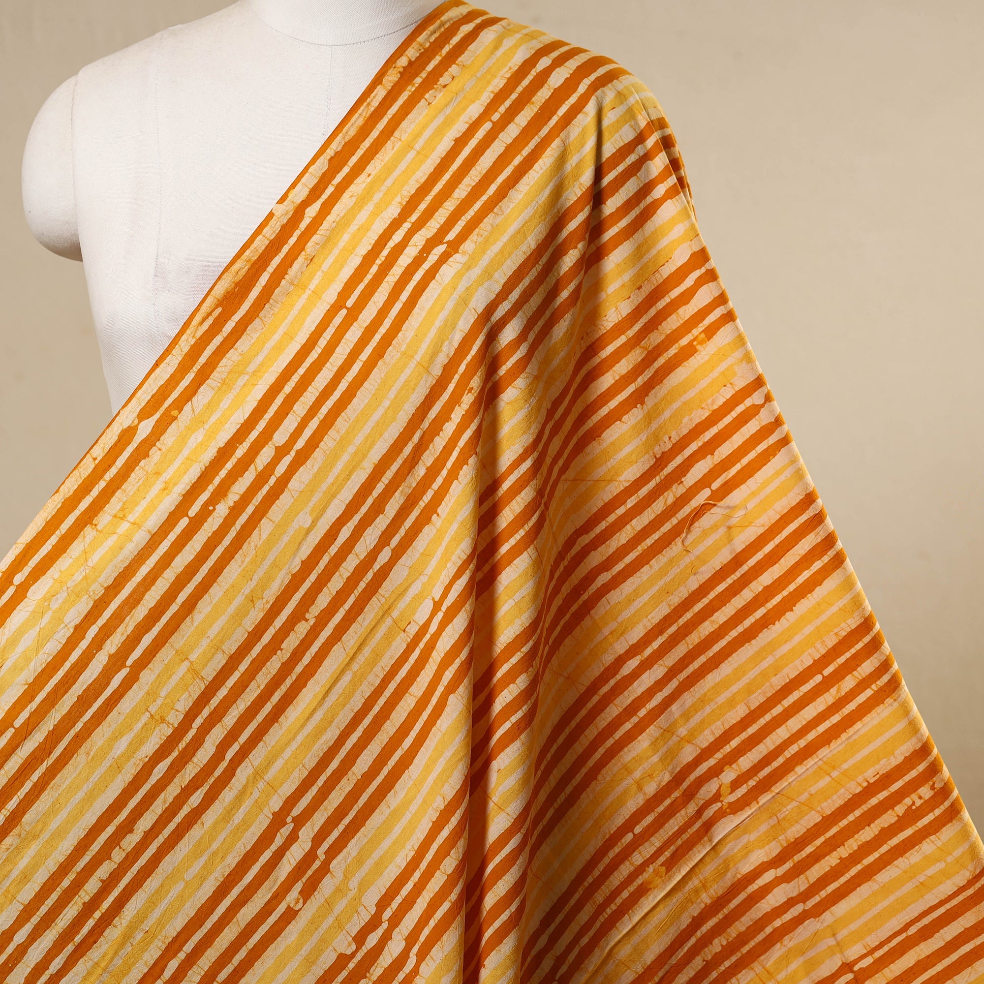 Elevate your creations with this yellow cotton batik print fabric, crafted by Shakil Ahmed Khatri from Kutch. Batik, the age-old wax-resist dyeing technique, lends the textile its layered textures and intricate motifs. Every yard reflects the heritage of Indian artisans, making it an ideal choice for distinctive apparel or elegant home décor projects.