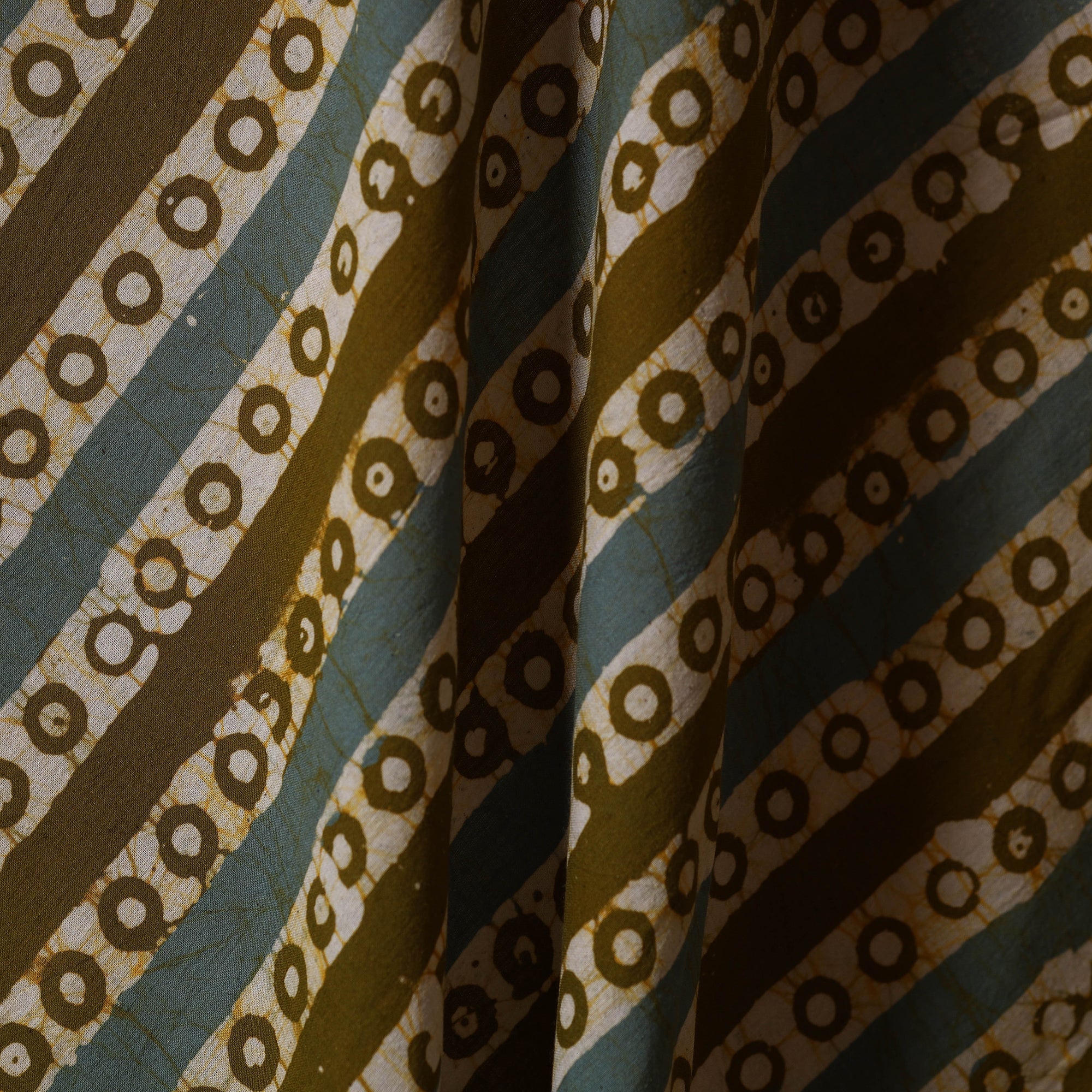 Elevate your creations with this green cotton batik print fabric, crafted by Shakil Ahmed Khatri from Kutch. Batik, the age-old wax-resist dyeing technique, lends the textile its layered textures and intricate motifs. Every yard reflects the heritage of Indian artisans, making it an ideal choice for distinctive apparel or elegant home décor projects.