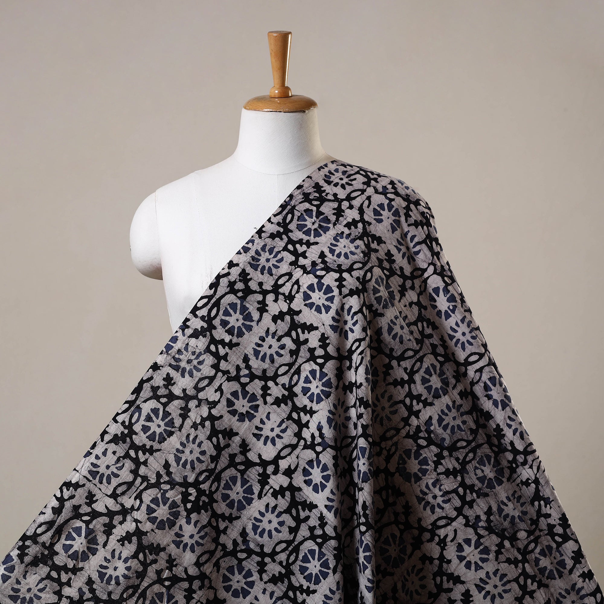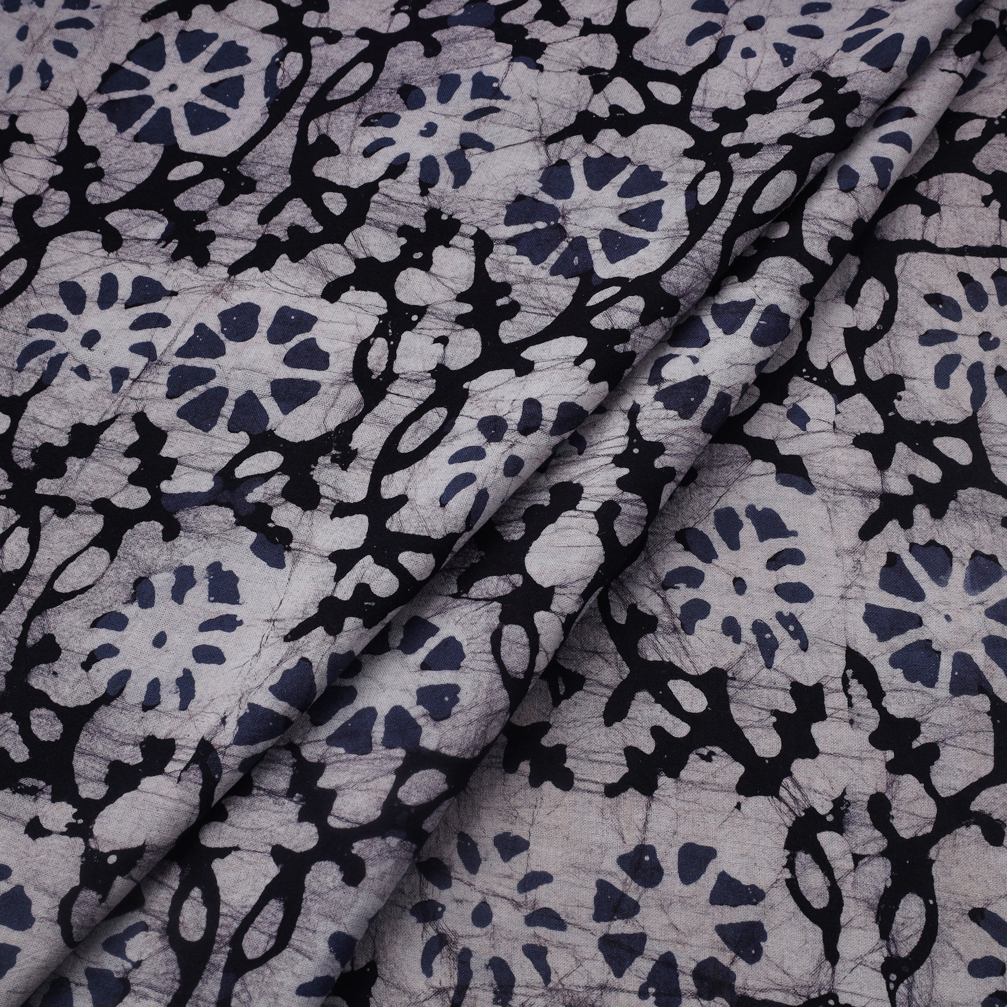 Experience traditional artistry with this black hand batik block print fabric from Kutch, made using the wax-resist dyeing technique passed down through generations. The process involves applying wax to cotton before dyeing, resulting in beautifully detailed motifs. This fabric is breathable, durable, and perfect for creating ethnic wear, casual outfits, or home decor accents.
