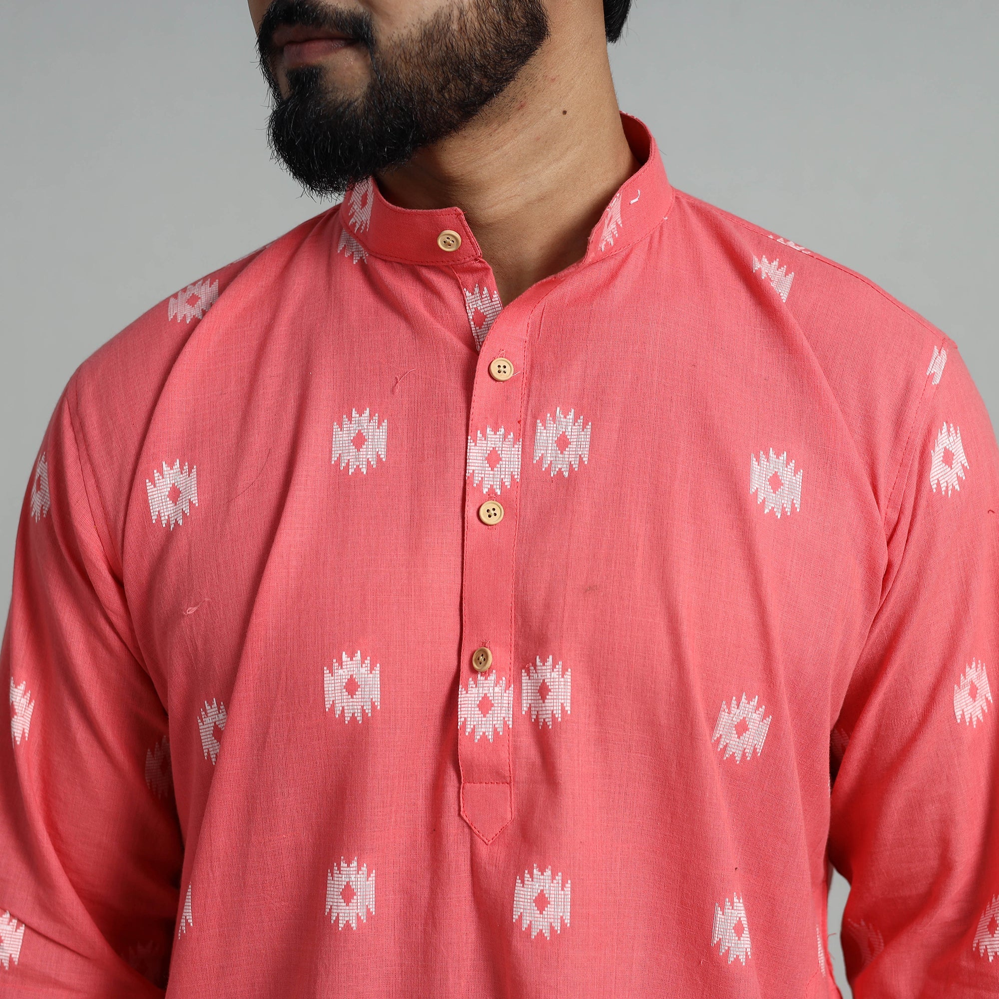Step into elegance with cotton long jacquard kurta for men, a perfect blend of tradition and style. Handcrafted from jacquard fabric, this long kurta features full sleeves, a front button placket, and a chinese collar for a modern touch. With functional side pockets, it’s designed for comfort and practicality. Ideal for festive occasions or casual wear, this kurta celebrates India’s artisanal heritage.