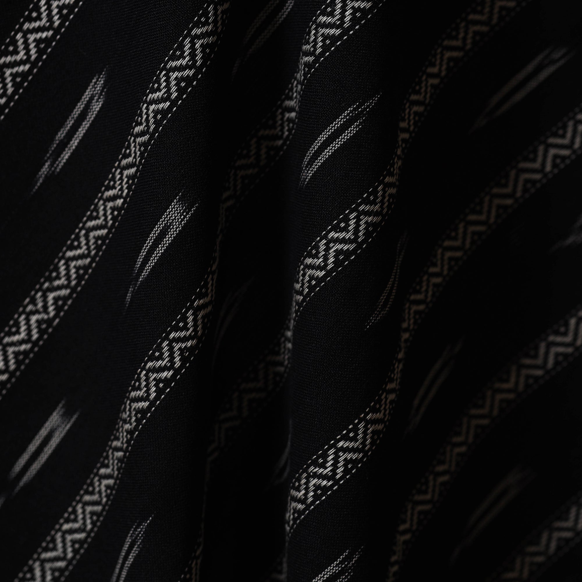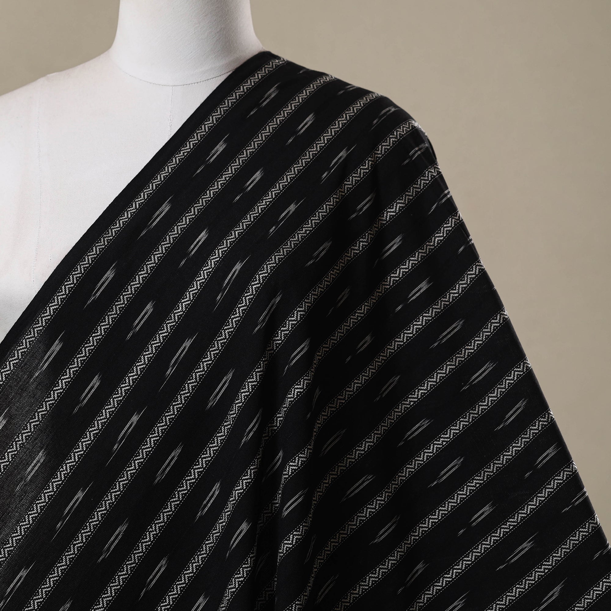 This black pochampally dabi ikat cotton fabric from Telangana is created using the traditional tie-dye technique on threads before weaving. The Dabi style adds a unique charm with its bold geometric patterns and vibrant look. This fabric is perfect for crafting elegant kurtas, dresses, tunics or adding a touch of artistic beauty to your home decor.