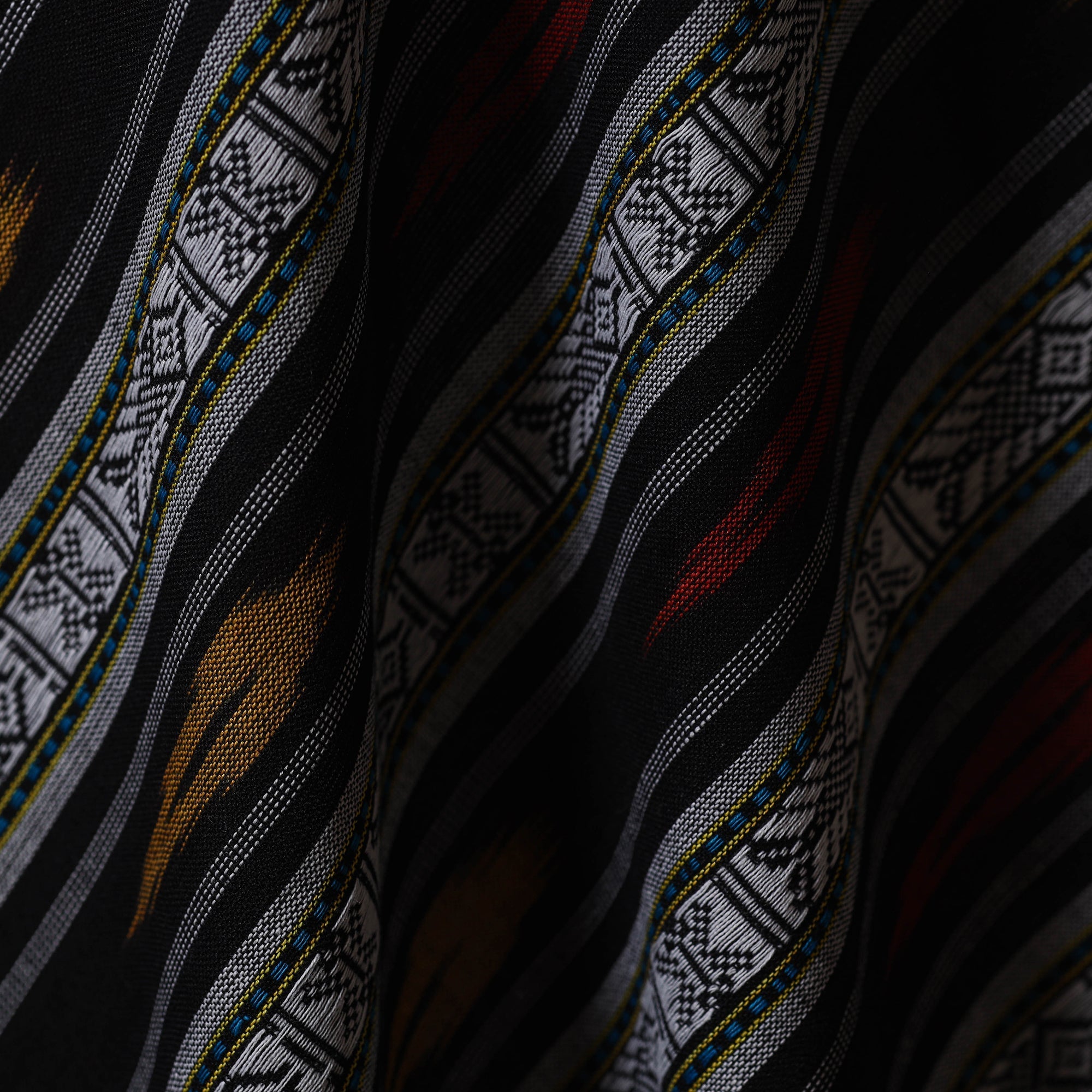 This black pochampally dabi ikat cotton fabric from Telangana is created using the traditional tie-dye technique on threads before weaving. The Dabi style adds a unique charm with its bold geometric patterns and vibrant look. This fabric is perfect for crafting elegant kurtas, dresses, tunics or adding a touch of artistic beauty to your home decor.