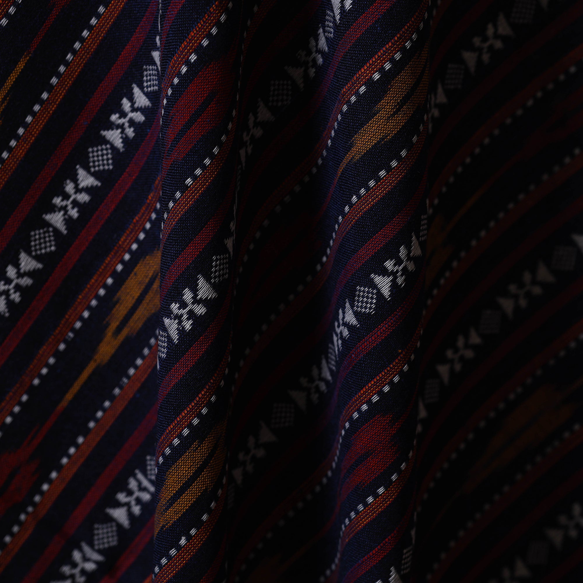 This pochampally dabi ikat cotton fabric from Telangana is created using the traditional tie-dye technique on threads before weaving. The Dabi style adds a unique charm with its bold geometric patterns and vibrant look. This fabric is perfect for crafting elegant kurtas, dresses, tunics or adding a touch of artistic beauty to your home decor.