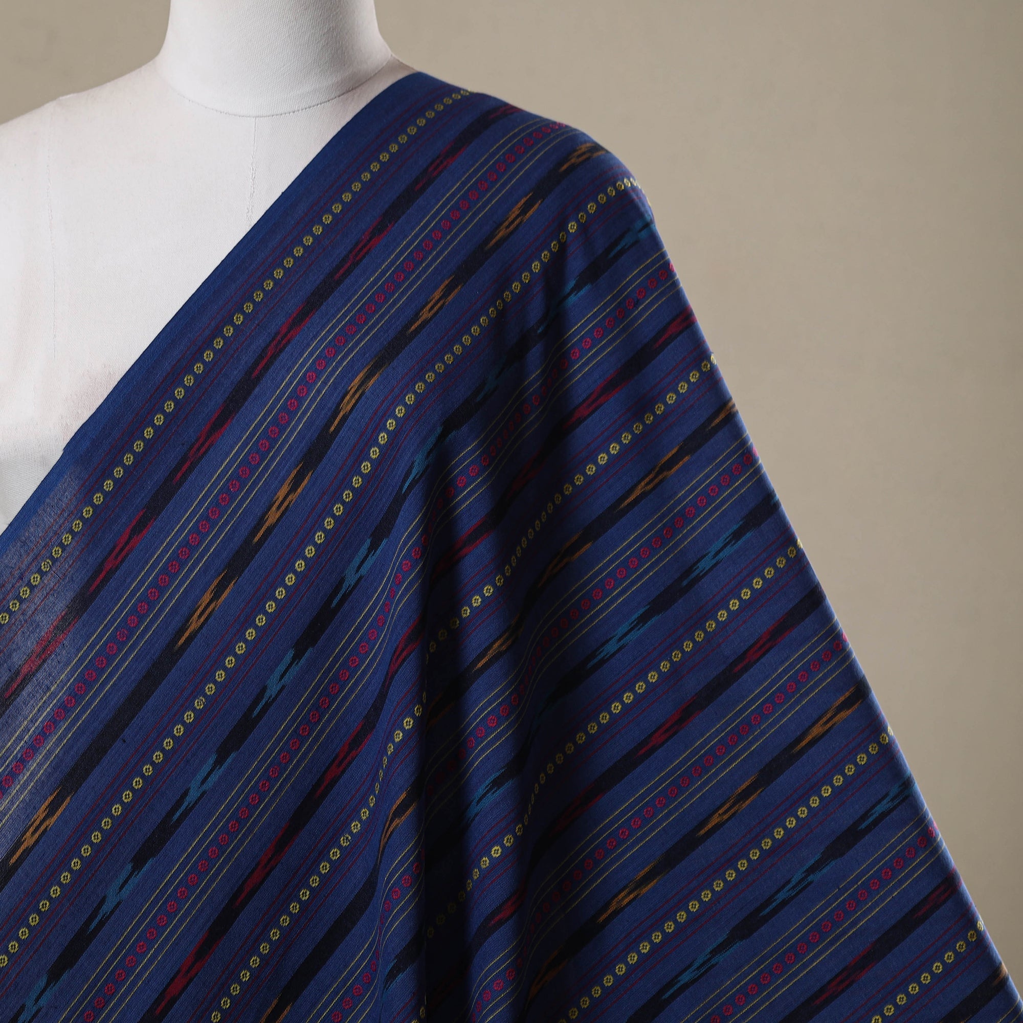 This blue pochampally dabi ikat cotton fabric from Telangana is created using the traditional tie-dye technique on threads before weaving. The Dabi style adds a unique charm with its bold geometric patterns and vibrant look. This fabric is perfect for crafting elegant kurtas, dresses, tunics or adding a touch of artistic beauty to your home decor.
