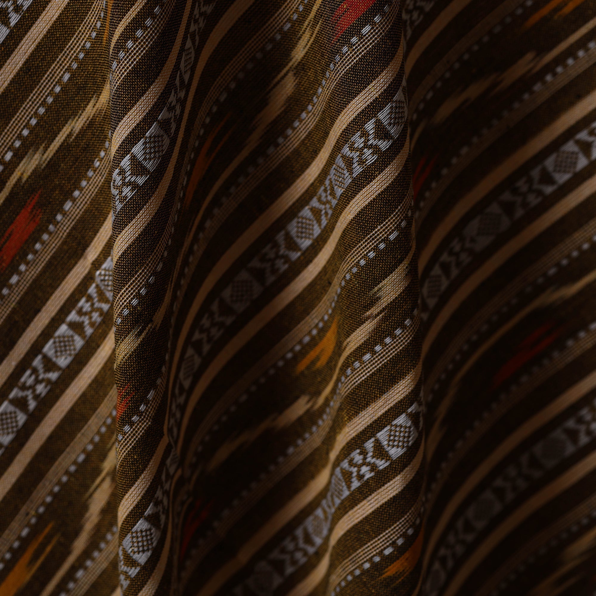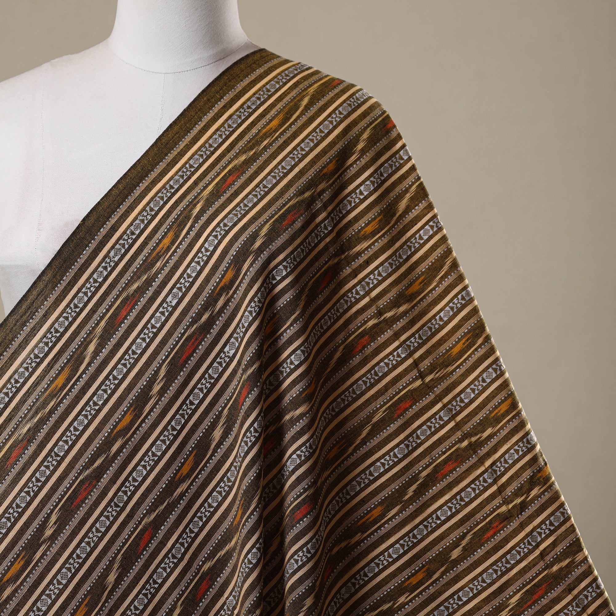 This brown pochampally dabi ikat cotton fabric from Telangana is created using the traditional tie-dye technique on threads before weaving. The Dabi style adds a unique charm with its bold geometric patterns and vibrant look. This fabric is perfect for crafting elegant kurtas, dresses, tunics or adding a touch of artistic beauty to your home decor.
