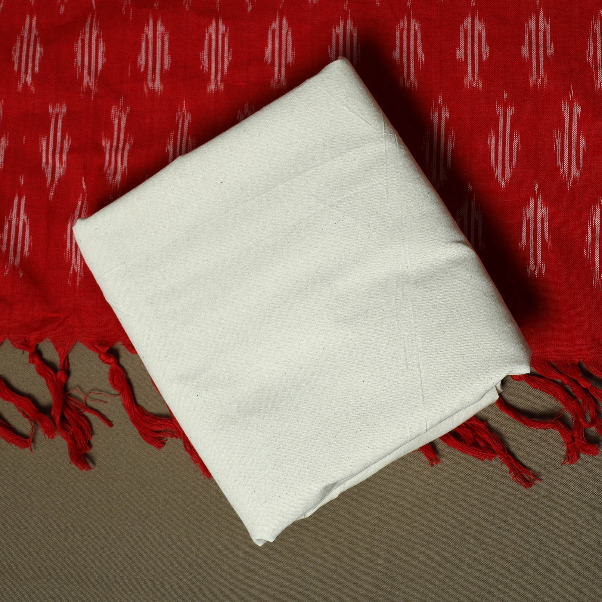 Pochampally ikat cotton 3pc unstitched dress material from Telangana using a resist-dye technique. Each thread is dyed before weaving to create the signature intricate Ikat patterns, the set includes a kurta, dupatta, and a plain bottom, offering a graceful drape and making it ideal for tailoring elegant ethnic wear.