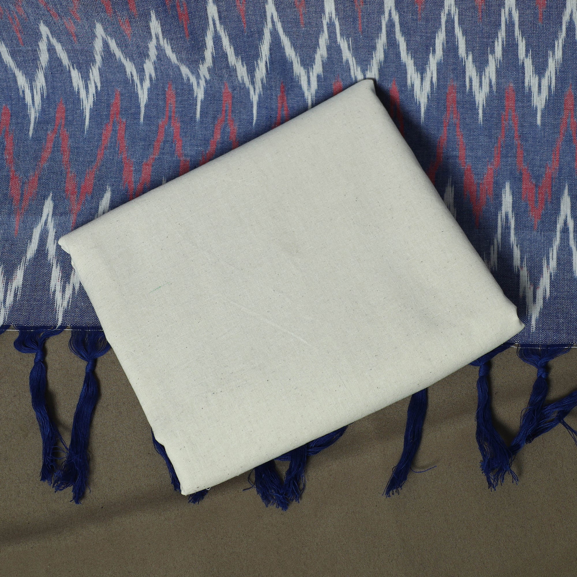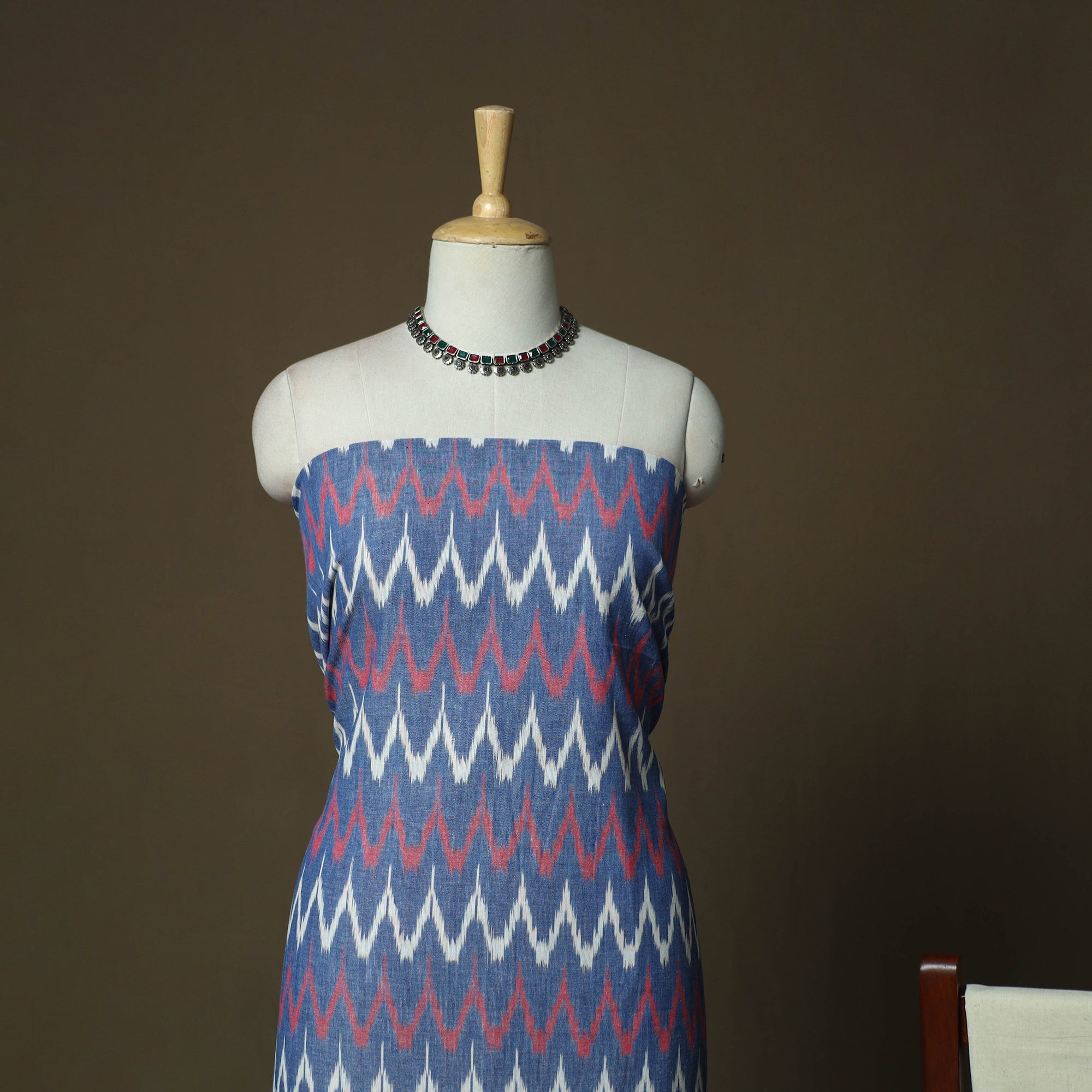 Pochampally ikat cotton 3pc unstitched dress material from Telangana using a resist-dye technique. Each thread is dyed before weaving to create the signature intricate Ikat patterns, the set includes a kurta, dupatta, and a plain bottom, offering a graceful drape and making it ideal for tailoring elegant ethnic wear.