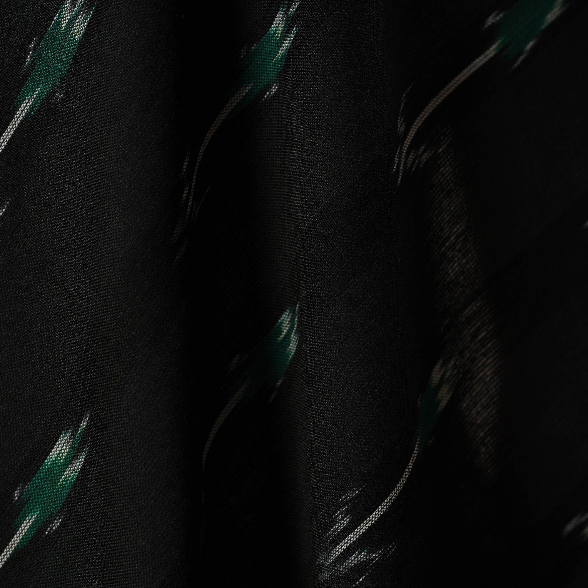 Pure cotton black pochampally ikat fabric from Telangana reflects India’s rich weaving tradition. Created using the Ikat resist-dye technique, where the warp and weft yarns are carefully dyed before weaving, this fabric is ideal for garments as well as creating home decor pieces.
