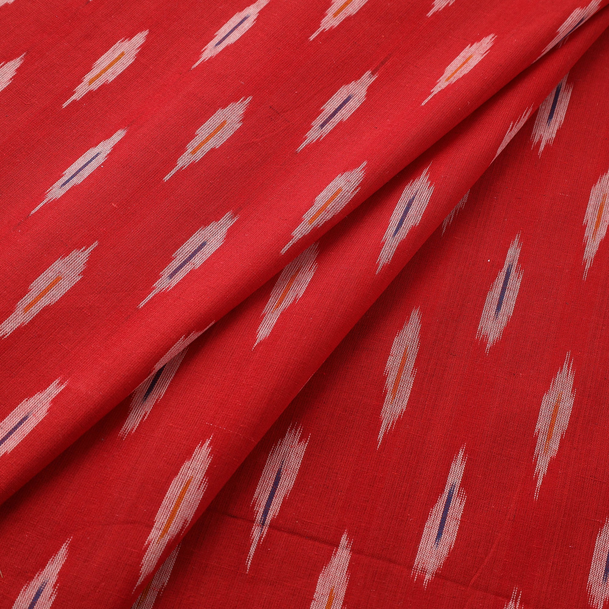 Red pochampally ikat cotton fabric from Telangana. Ikat is a centuries old resist dyeing technique where patterns are created on the warp or weft threads before weaving, similar to tie-dye. World-famous for its vibrant colours, distinctive texture and intricate designs, this fabric is ideal for creating kurtas, dresses, tunics or decorative home accents. This is a power loom fabric, made using the traditional hand tie-dye ikat method.