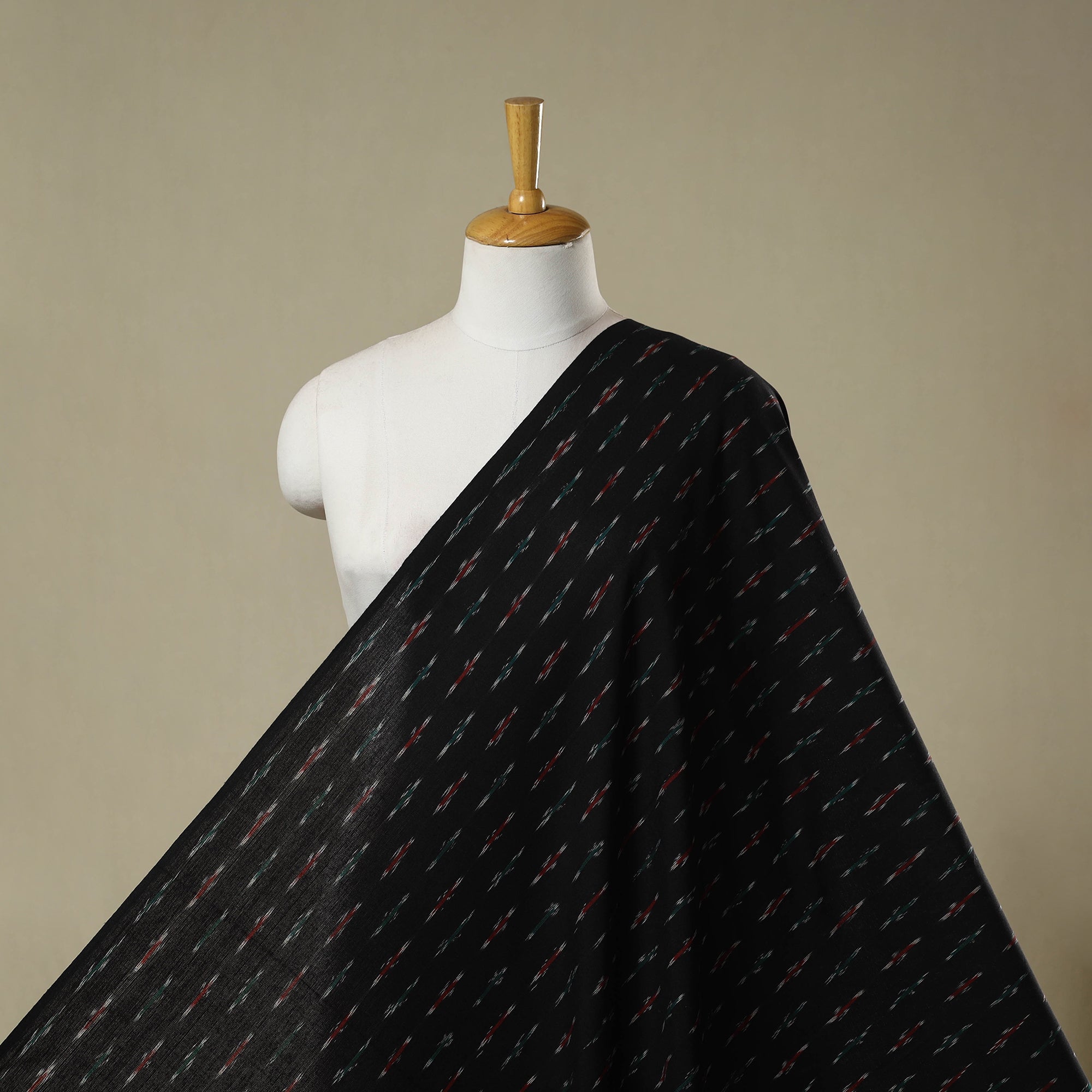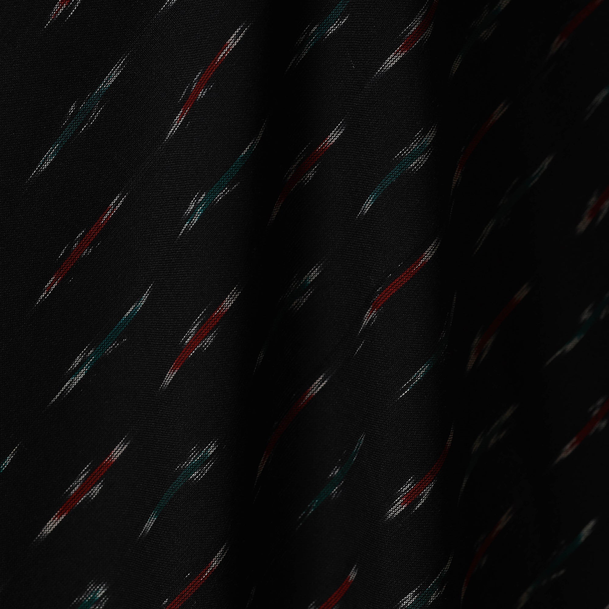 Fine quality black pochampally ikat cotton fabric from Telangana. Ikat is a unique dyeing technique that uses a resist process, similar to tie-dye, applied on either the warp or weft threads before weaving. It features striking patterns and is world-famous for its vibrant colors, distinctive texture and intricate designs. Ideal for creating kurtas, dresses, tunics or decorative home accents. This is a power loom fabric, crafted using the traditional hand tie-dye method.
