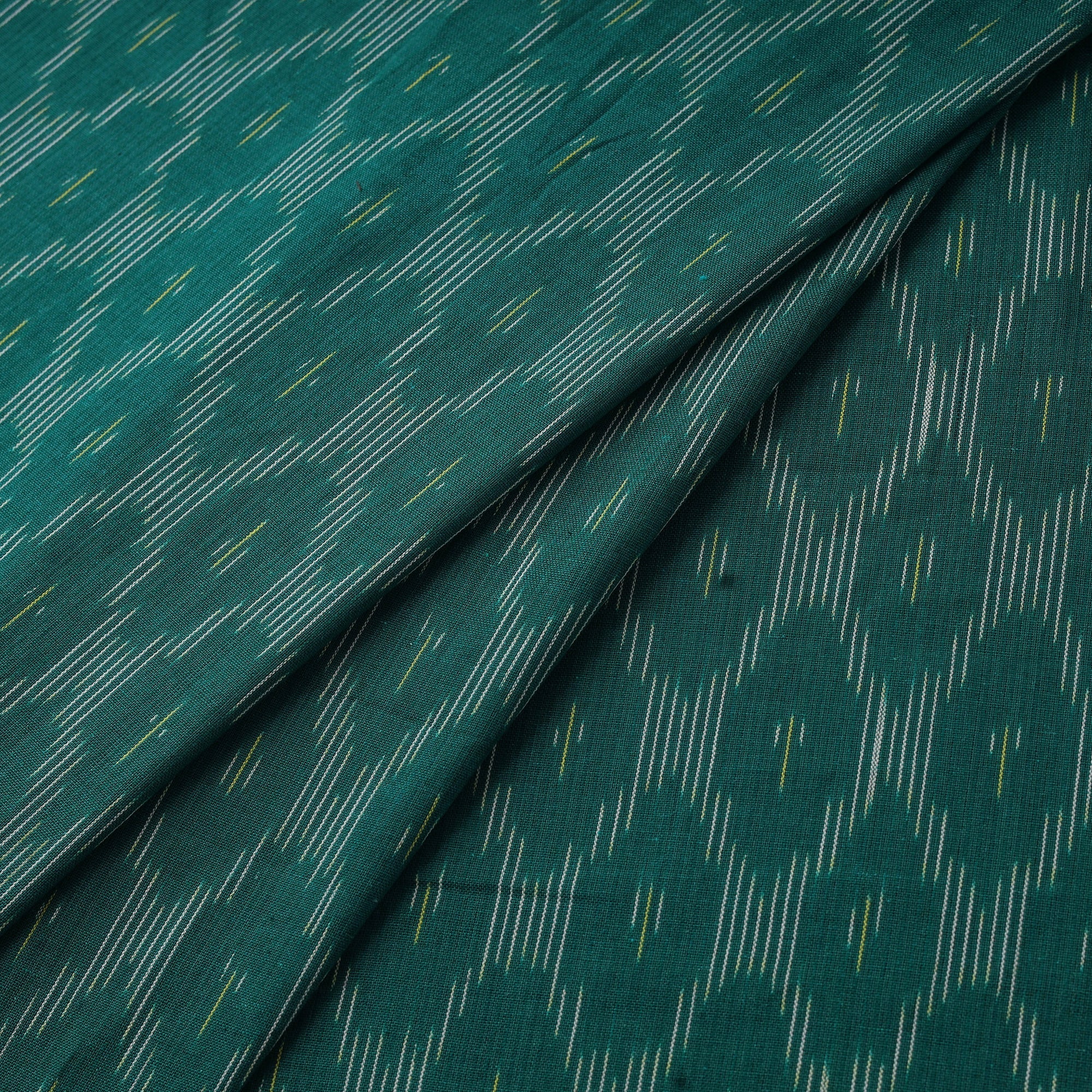 Green pure cotton pochampally ikat fabric from Telangana reflects India’s rich weaving tradition. Created using the Ikat resist-dye technique, where the warp and weft yarns are carefully dyed before weaving, this fabric is ideal for garments as well as creating home decor pieces.