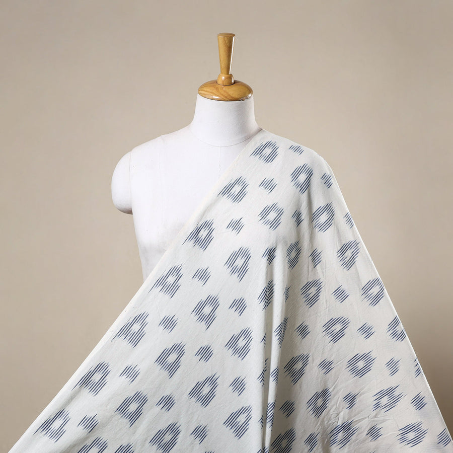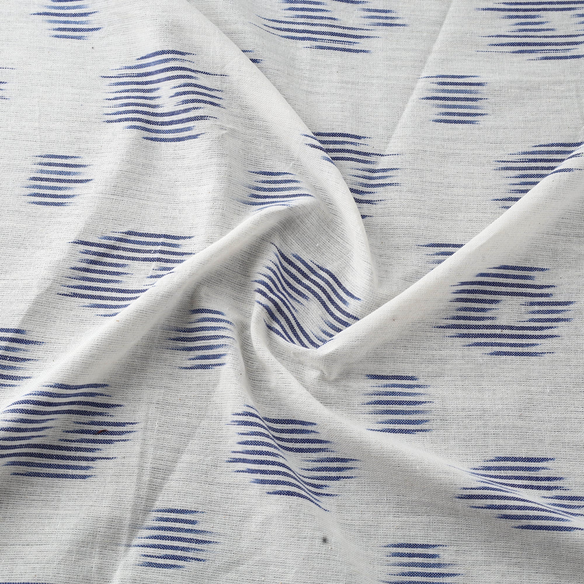 Fine quality white pochampally Ikat cotton fabric from Telangana. Ikat is a unique dyeing technique that uses a resist process, similar to tie-dye, applied on either the warp or weft threads before weaving. It features striking patterns and is world-famous for its vibrant colors, distinctive texture, and intricate designs. Ideal for creating kurtas, dresses, tunics, or decorative home accents. This is a power loom fabric, crafted using the traditional hand tie-dye method.