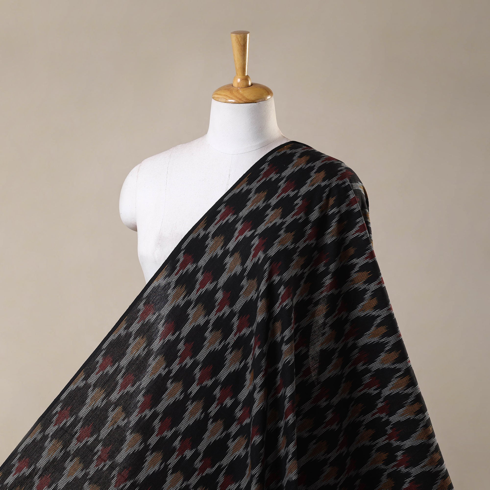 Fine quality black pochampally Ikat cotton fabric from Telangana. Ikat is a unique dyeing technique that uses a resist process, similar to tie-dye, applied on either the warp or weft threads before weaving. It features striking patterns and is world-famous for its vibrant colors, distinctive texture, and intricate designs. Ideal for creating kurtas, dresses, tunics, or decorative home accents. This is a power loom fabric, crafted using the traditional hand tie-dye method.