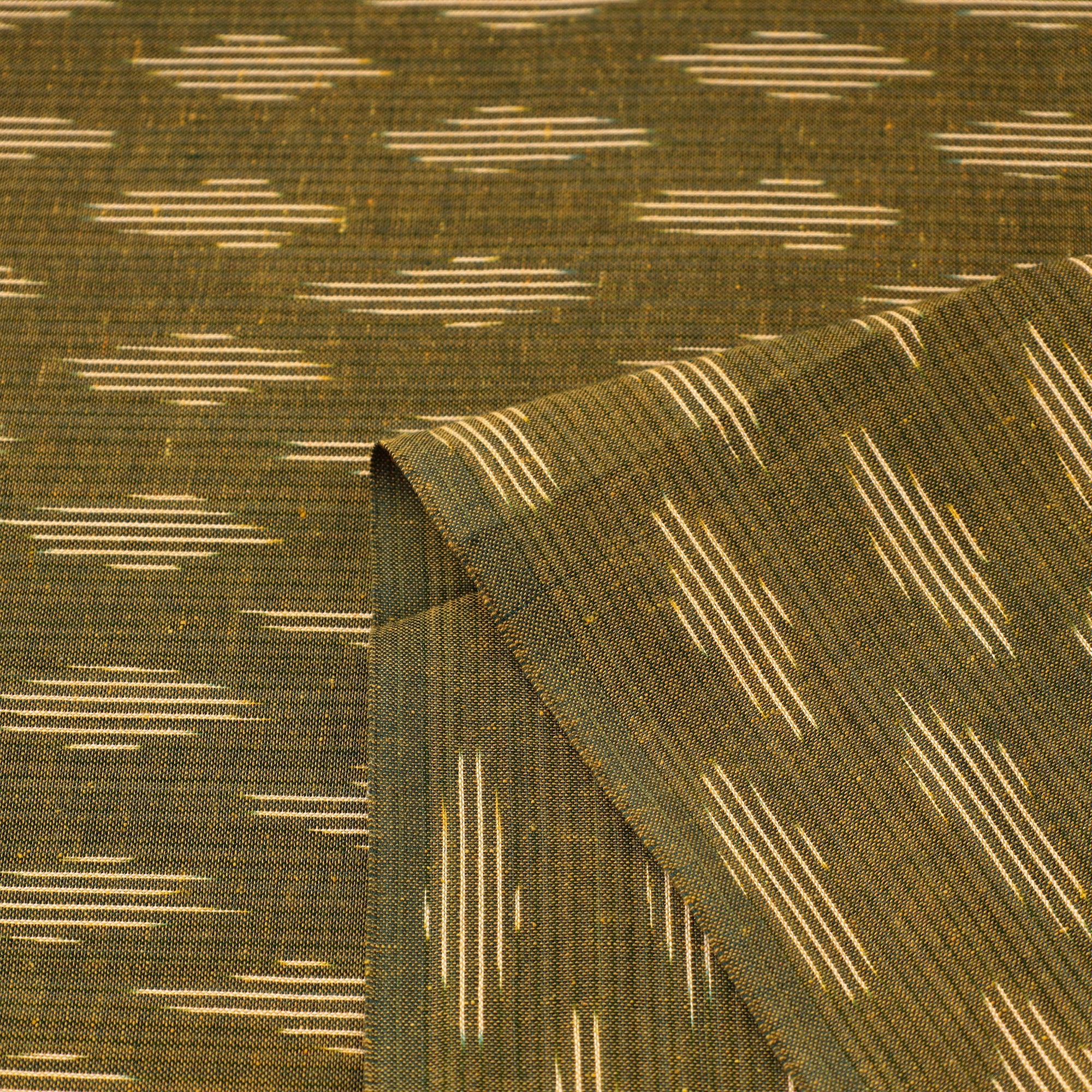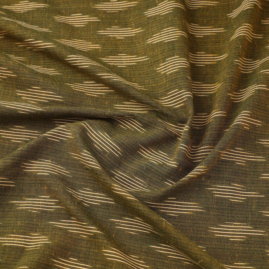 Fine quality cotton olive green pochampally ikat fabric from Ramannapeta, Telangana. Ikat (Ikkat) is a dyeing technique used to pattern textiles that employs a resist dyeing process similar to tie-dye on either the warp or weft fibers prior to dyeing. Ikat has lovely patterns and are world famous for their extremely beautiful colors, texture and designs. Perfect for both traditional and modern projects.