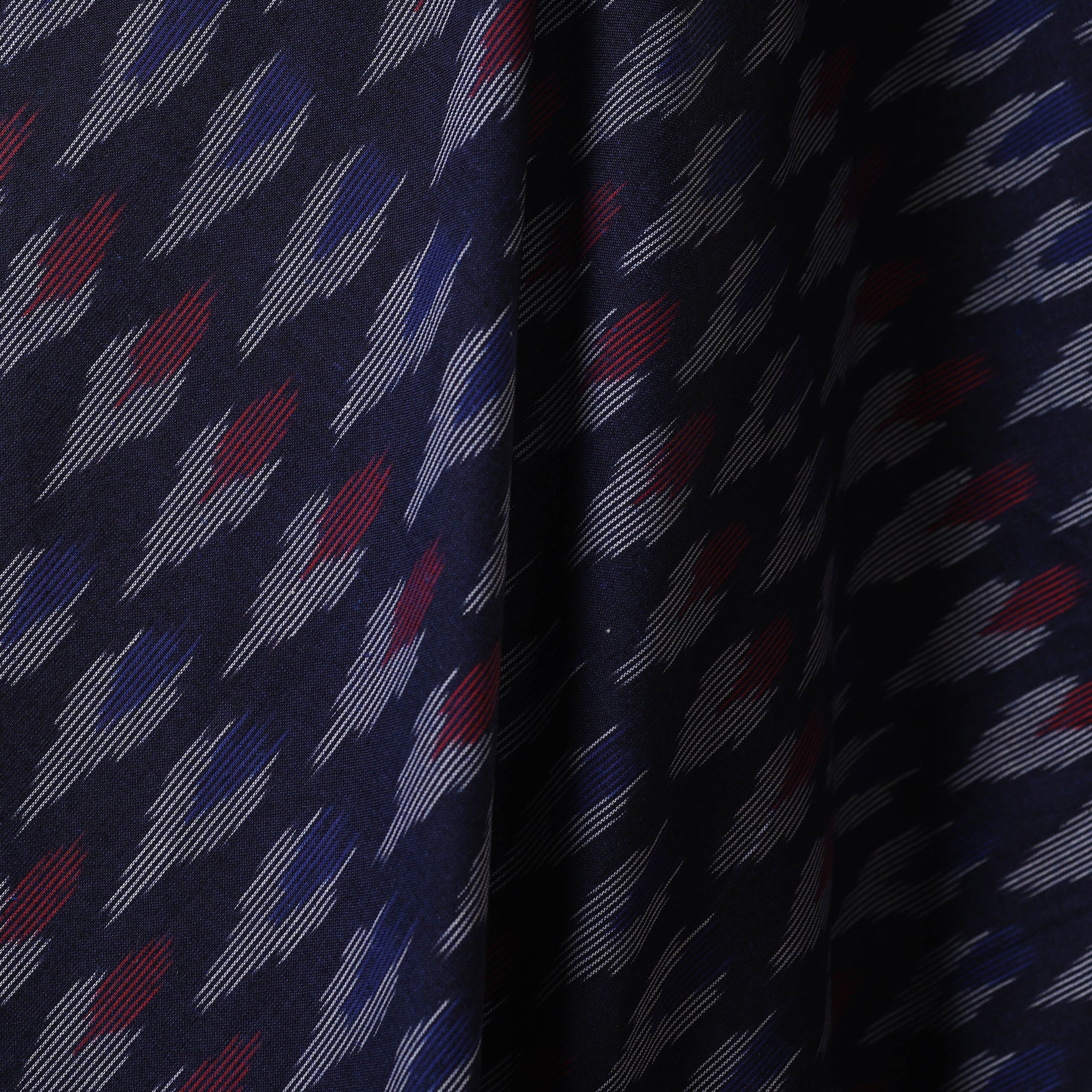 Fine quality blue pochampally Ikat cotton fabric from Telangana. Ikat is a unique dyeing technique that uses a resist process, similar to tie-dye, applied on either the warp or weft threads before weaving. It features striking patterns and is world-famous for its vibrant colors, distinctive texture, and intricate designs. Ideal for creating kurtas, dresses, tunics, or decorative home accents. This is a power loom fabric, crafted using the traditional hand tie-dye method.