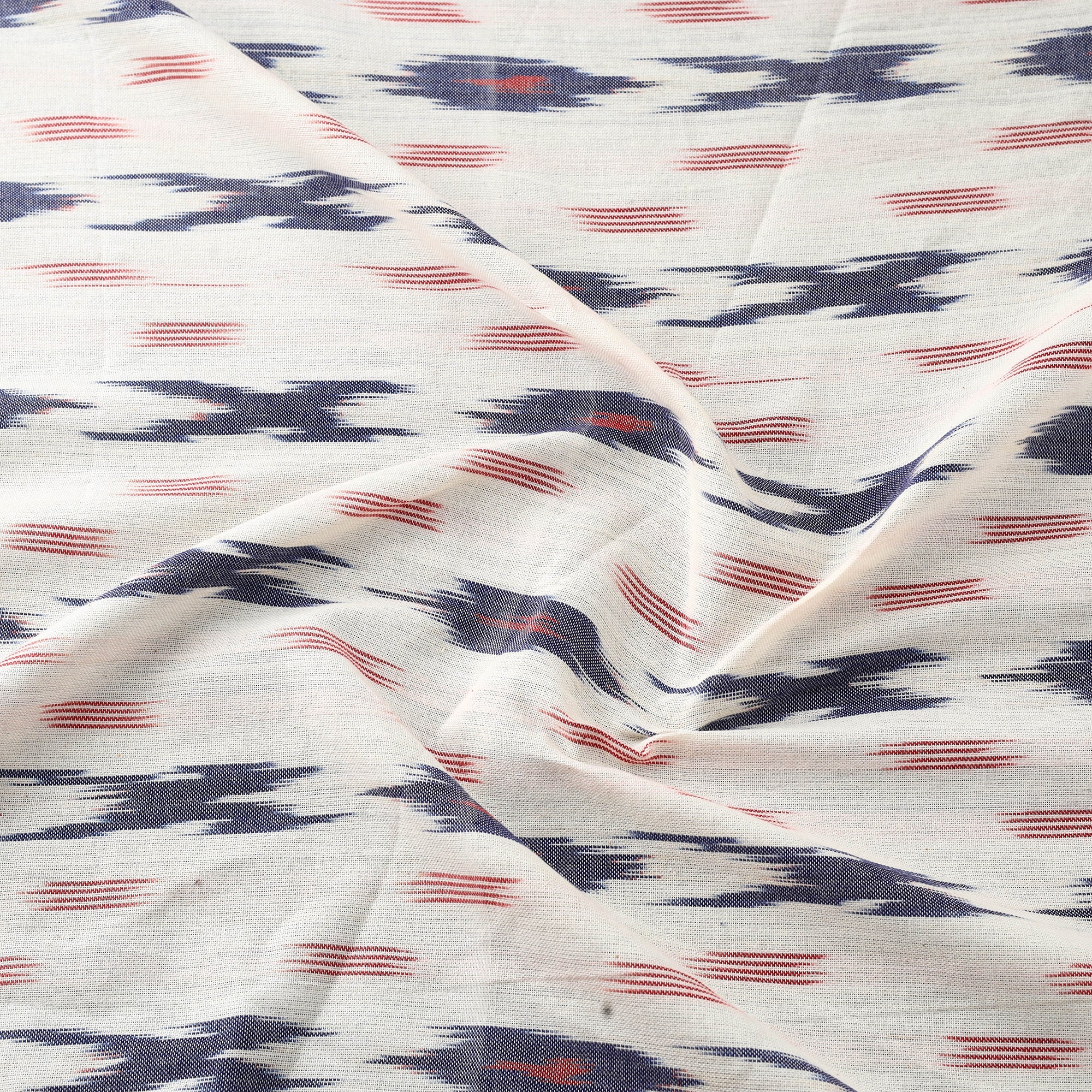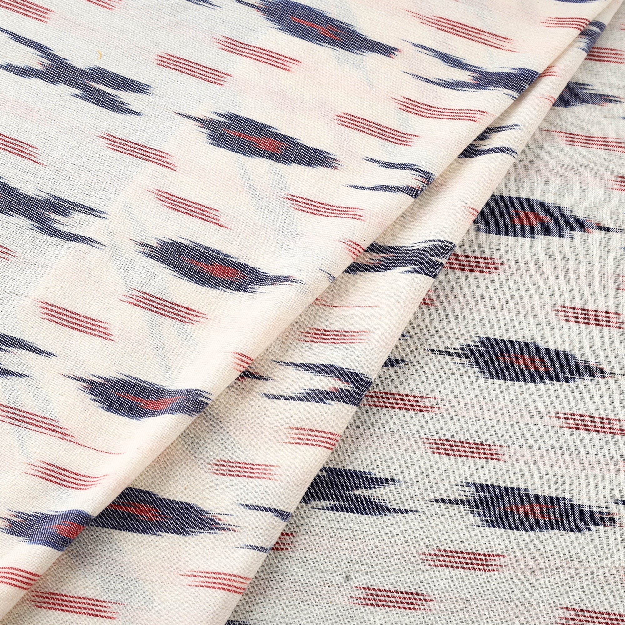 Fine quality white pochampally Ikat cotton fabric from Telangana. Ikat is a unique dyeing technique that uses a resist process, similar to tie-dye, applied on either the warp or weft threads before weaving. It features striking patterns and is world-famous for its vibrant colors, distinctive texture, and intricate designs. Ideal for creating kurtas, dresses, tunics, or decorative home accents. This is a power loom fabric, crafted using the traditional hand tie-dye method.