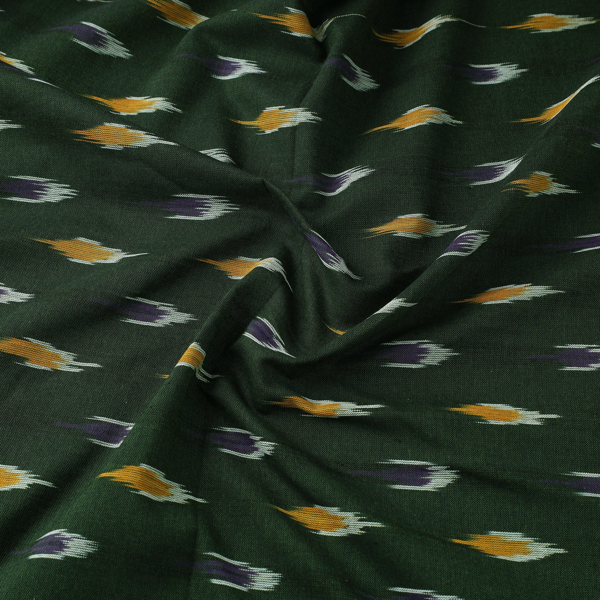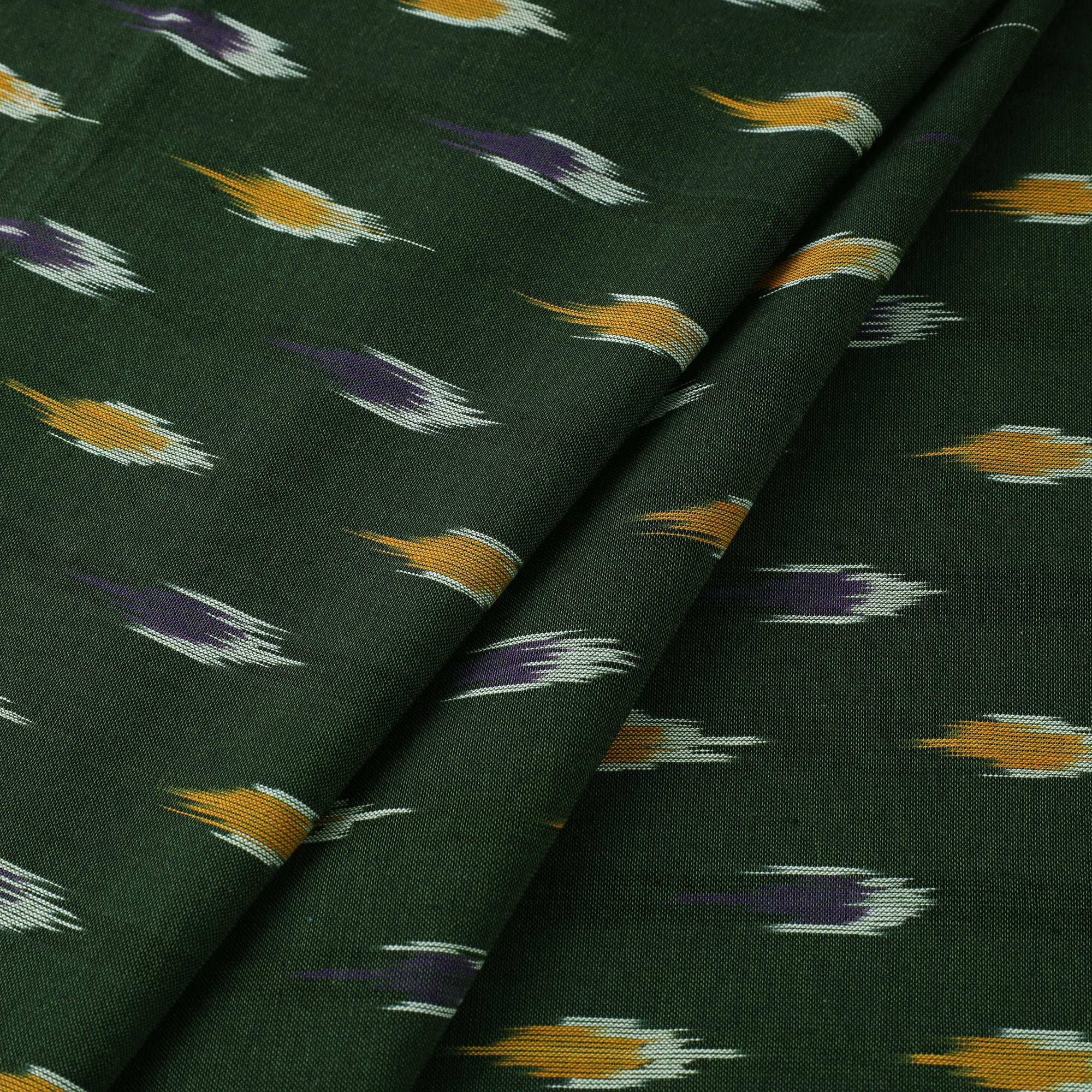This green cotton pochampally Ikat fabric is a traditional weave from Telangana, known for its precision and vibrant patterns. The designs are crafted using a resist dyeing technique where threads are dyed before weaving, resulting in striking geometric motifs. Appreciated for its rich texture, this fabric is ideal for ethnic wear, home décor, or creative sewing projects.