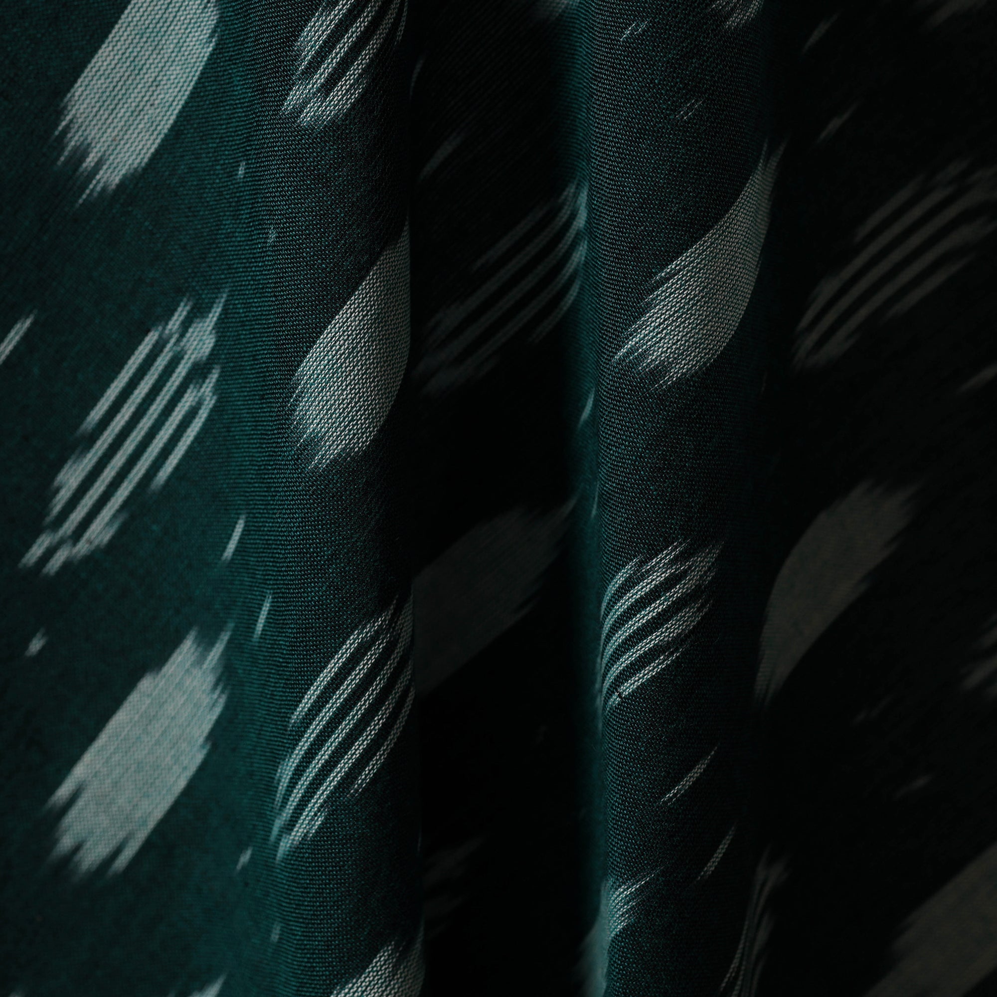 Pure cotton green pochampally ikat fabric from Telangana reflects India’s rich weaving tradition. Created using the Ikat resist-dye technique, where the warp and weft yarns are carefully dyed before weaving, this fabric is ideal for garments as well as creating home decor pieces.
