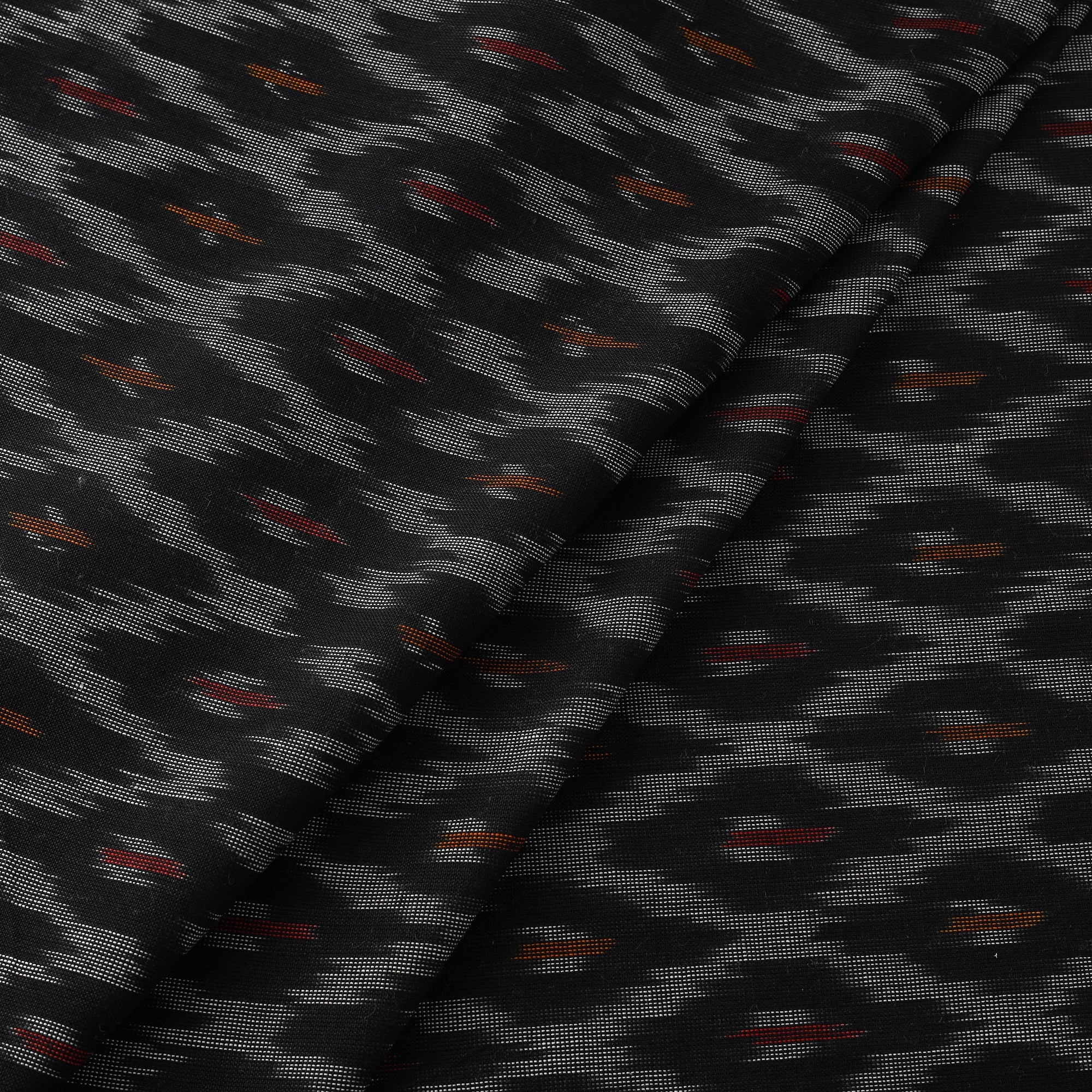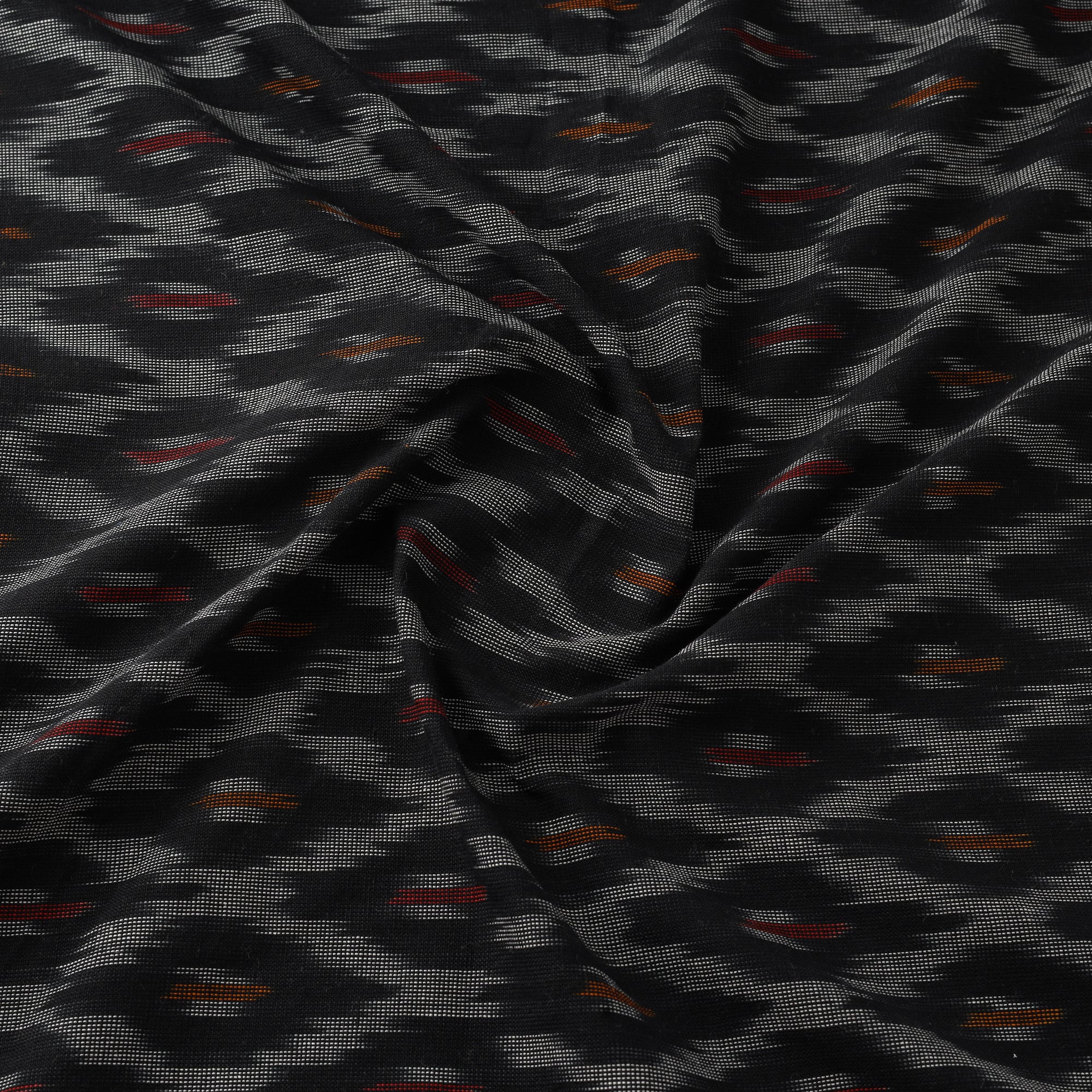 Fine quality black pochampally Ikat cotton fabric from Telangana. Ikat is a unique dyeing technique that uses a resist process, similar to tie-dye, applied on either the warp or weft threads before weaving. It features striking patterns and is world-famous for its vibrant colors, distinctive texture, and intricate designs. Ideal for creating kurtas, dresses, tunics, or decorative home accents. This is a power loom fabric, crafted using the traditional hand tie-dye method.