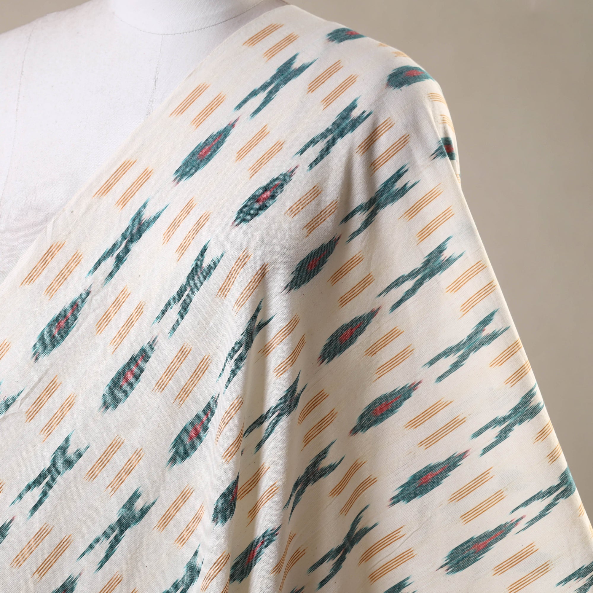 Fine quality white pochampally Ikat cotton fabric from Telangana. Ikat is a unique dyeing technique that uses a resist process, similar to tie-dye, applied on either the warp or weft threads before weaving. It features striking patterns and is world-famous for its vibrant colors, distinctive texture, and intricate designs. Ideal for creating kurtas, dresses, tunics, or decorative home accents. This is a power loom fabric, crafted using the traditional hand tie-dye method.