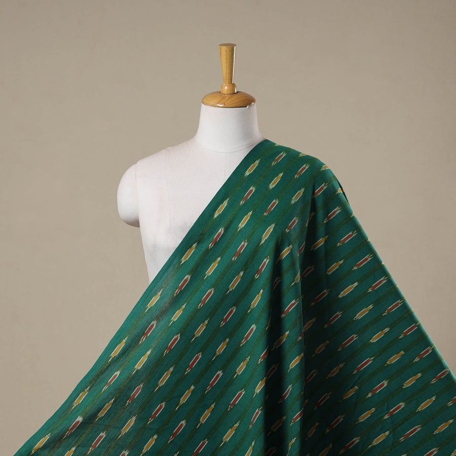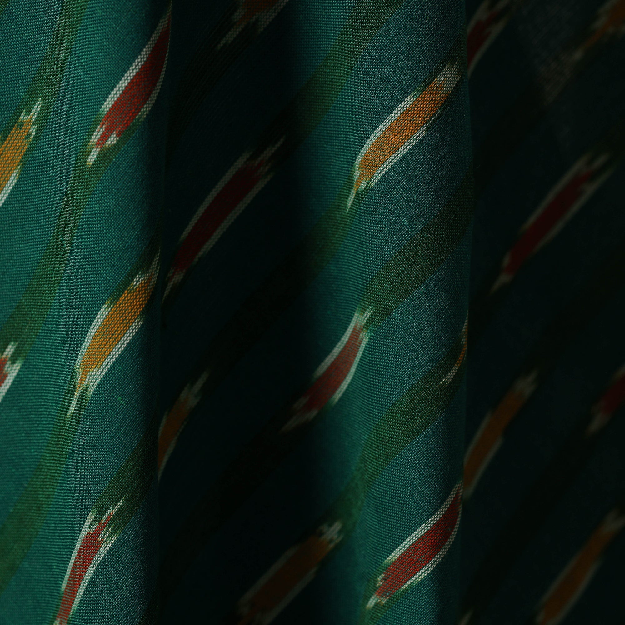Pure cotton green pochampally ikat fabric from Telangana reflects India’s rich weaving tradition. Created using the Ikat resist-dye technique, where the warp and weft yarns are carefully dyed before weaving, this fabric is ideal for garments as well as creating home decor pieces.