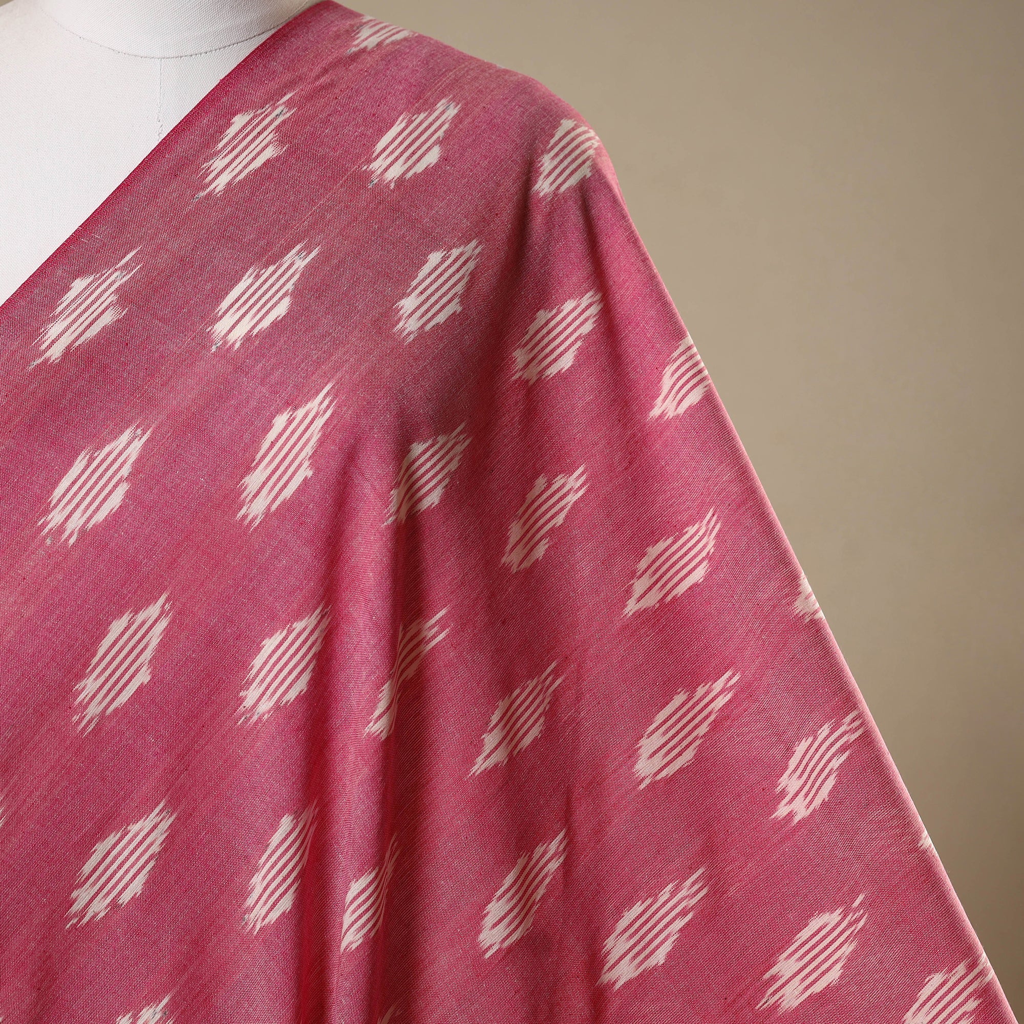 This pink cotton pochampally Ikat fabric from Telangana reflects the elegance of India’s iconic weaving tradition. Created through the intricate Ikat resist-dye technique, where the warp and weft yarns are carefully dyed before weaving, it forms striking geometric patterns. Celebrated for its vibrant shades and distinctive textures, this fabric is ideal for tailoring garments as well as designing home decor pieces.