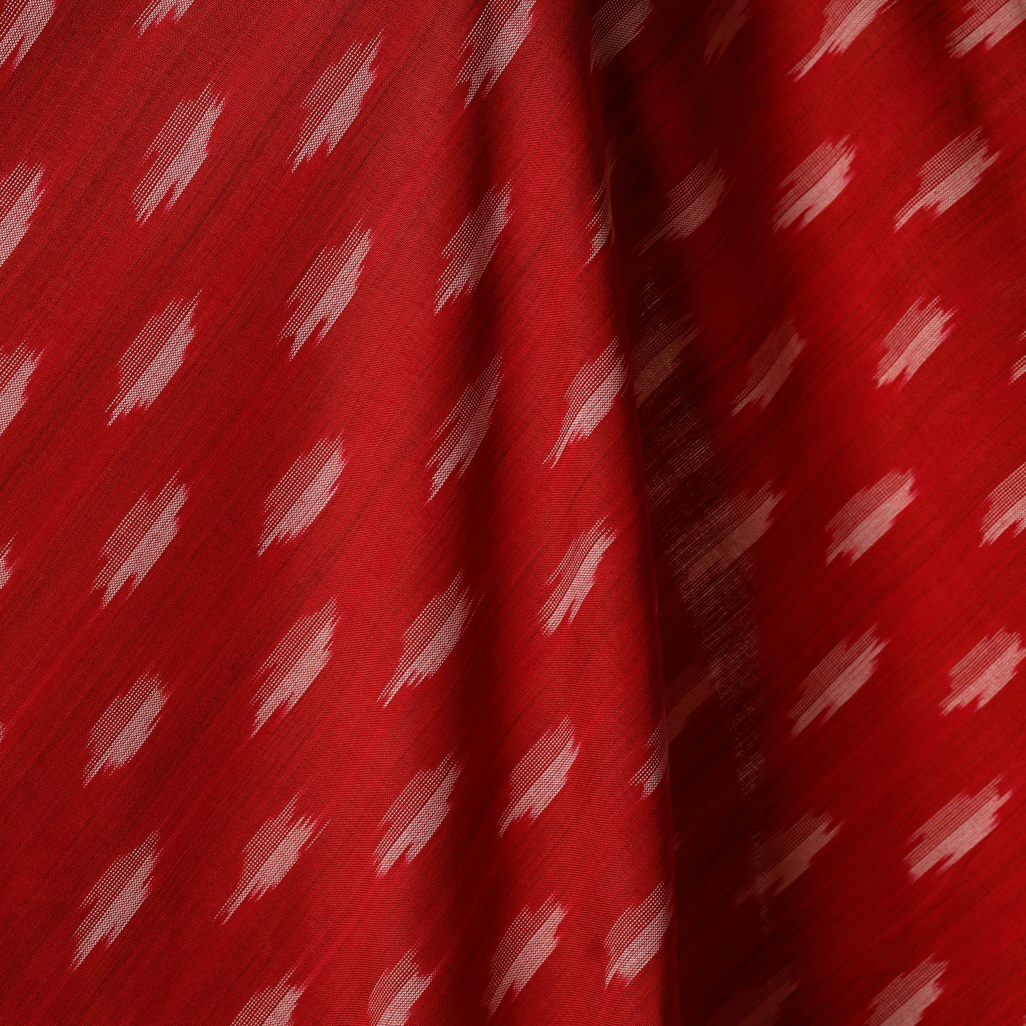 This red cotton pochampally Ikat fabric from Telangana reflects the elegance of India’s iconic weaving tradition. Created through the intricate Ikat resist-dye technique, where the warp and weft yarns are carefully dyed before weaving, it forms striking geometric patterns. Celebrated for its vibrant shades and distinctive textures, this fabric is ideal for tailoring garments as well as designing home decor pieces.