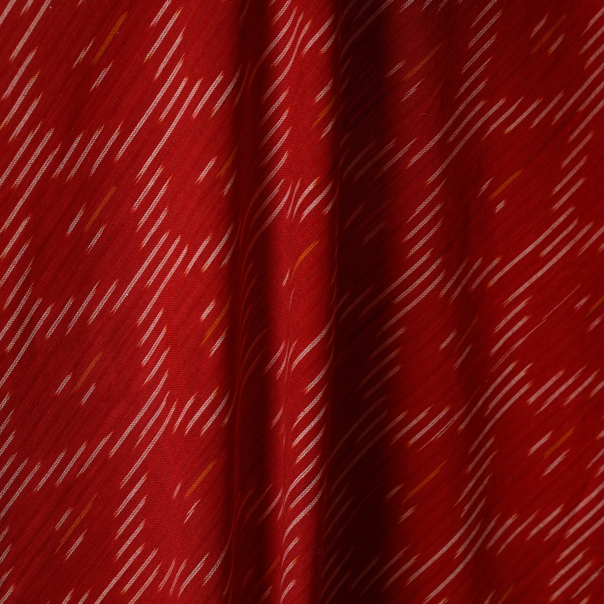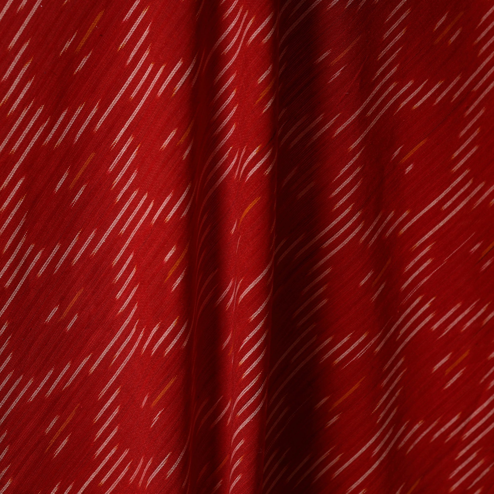 This red cotton pochampally Ikat fabric from Telangana reflects the elegance of India’s iconic weaving tradition. Created through the intricate Ikat resist-dye technique, where the warp and weft yarns are carefully dyed before weaving, it forms striking geometric patterns. Celebrated for its vibrant shades and distinctive textures, this fabric is ideal for tailoring garments as well as designing home decor pieces.