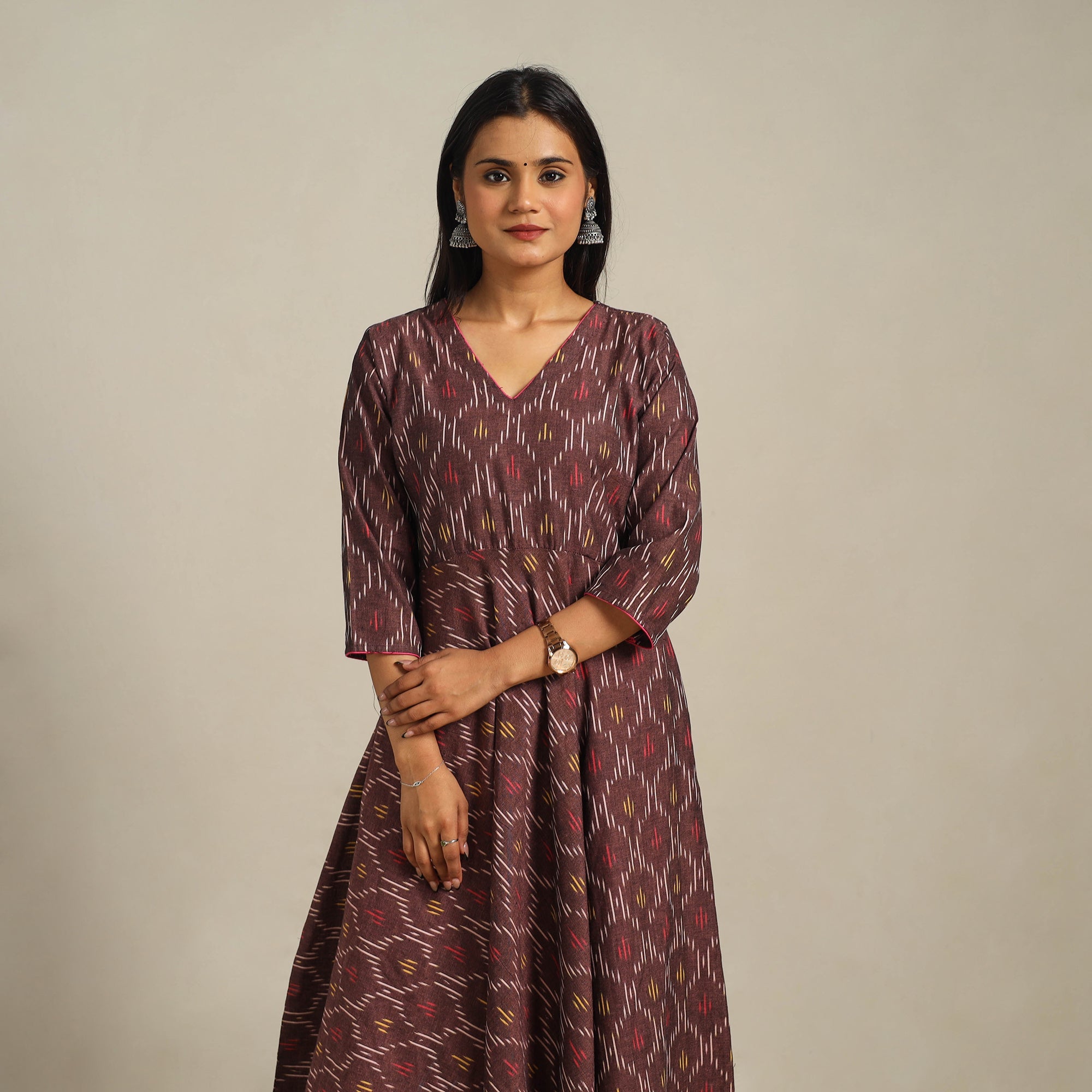 This brown cotton pochampally Ikat kurta set highlights the traditional weaving artistry of Telangana. It features a comfortable A-line kurta with a side pocket and a plain palazzo that comes with two side pockets and an elasticated waistband. The Ikat technique involves resist-dyeing the yarns before weaving, resulting in distinctive, intricate patterns. Perfect for daily wear, office looks, casual outings, or laid-back gatherings.