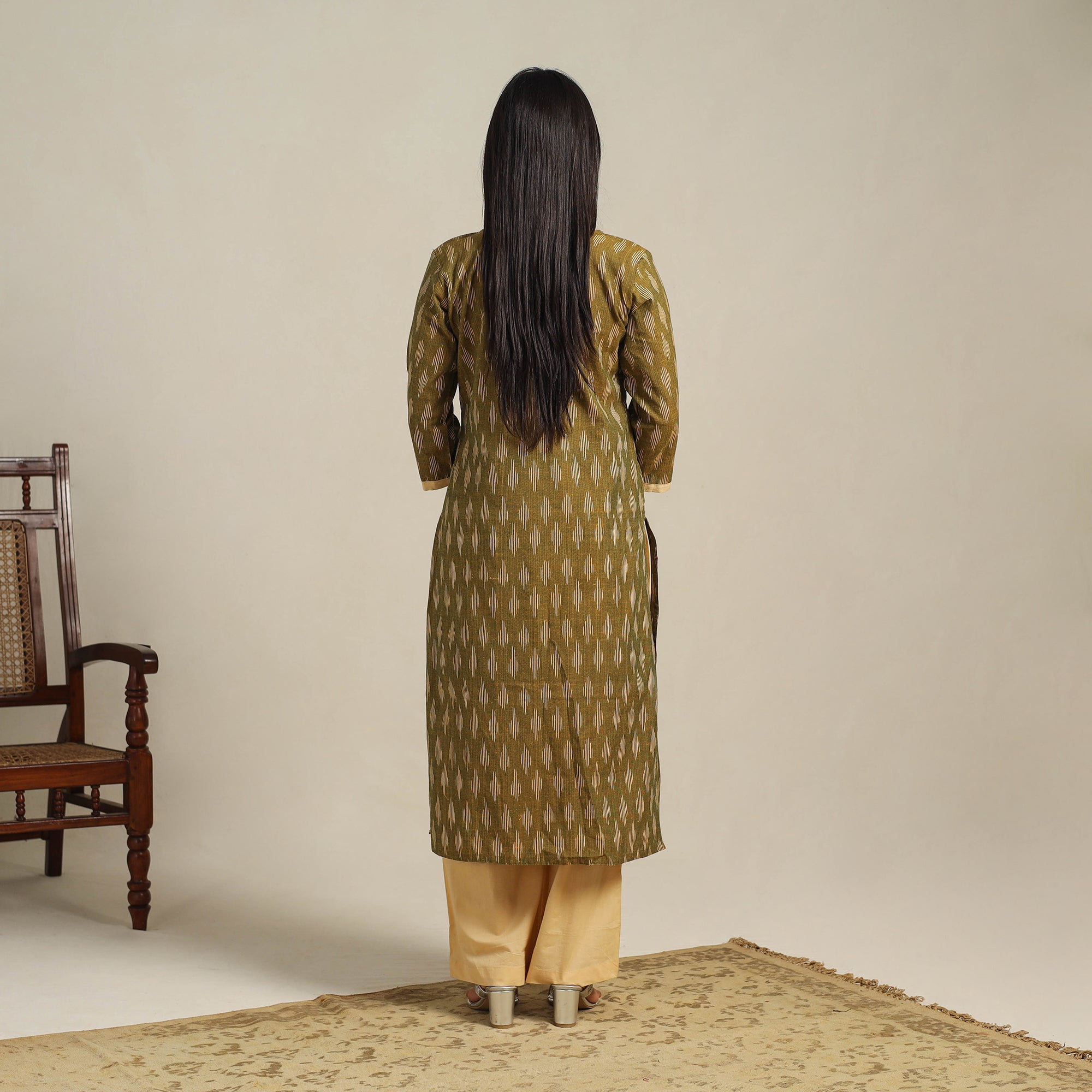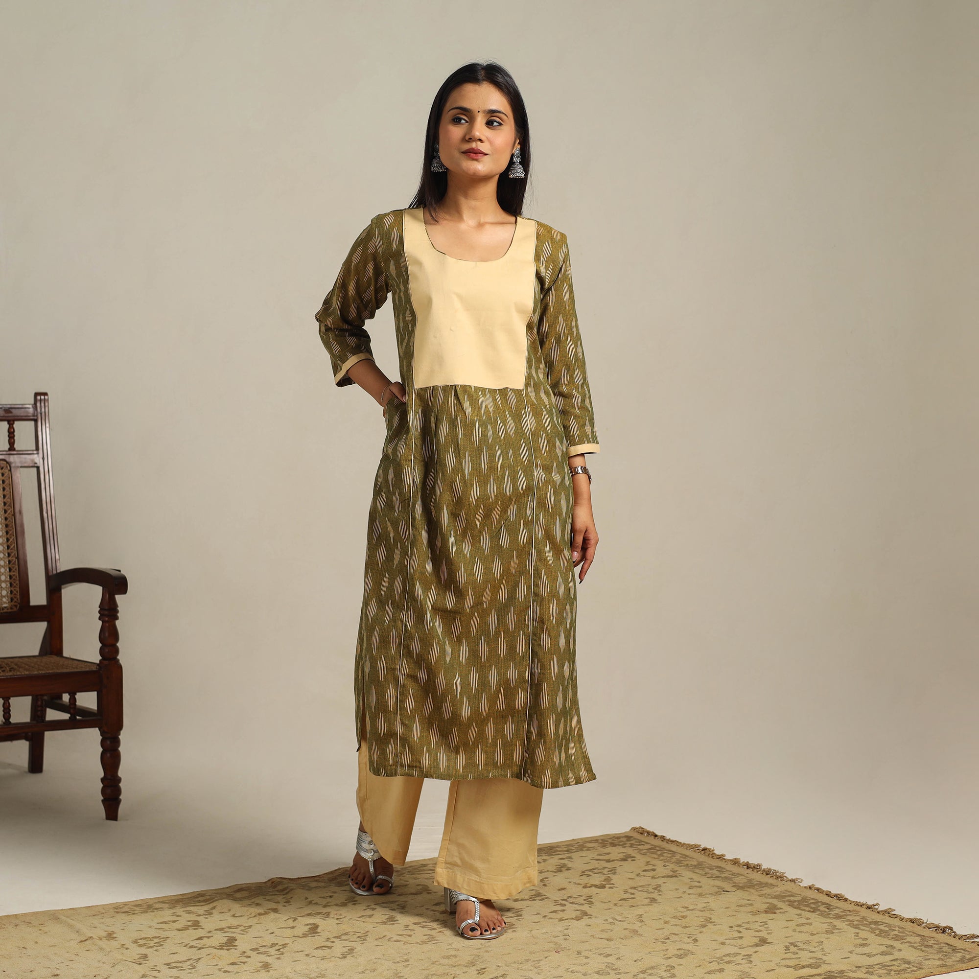 This green cotton pochampally Ikat kurta set highlights the traditional weaving artistry of Telangana. It features a comfortable straight kurta with a subtle plain patch accent and a functional side pocket, paired with a plain palazzo that includes two side pockets and an elasticated waistband. The Ikat technique, where yarns are resist-dyed before weaving. Perfect for daily wear, office attire, casual outings, or laid-back gatherings.