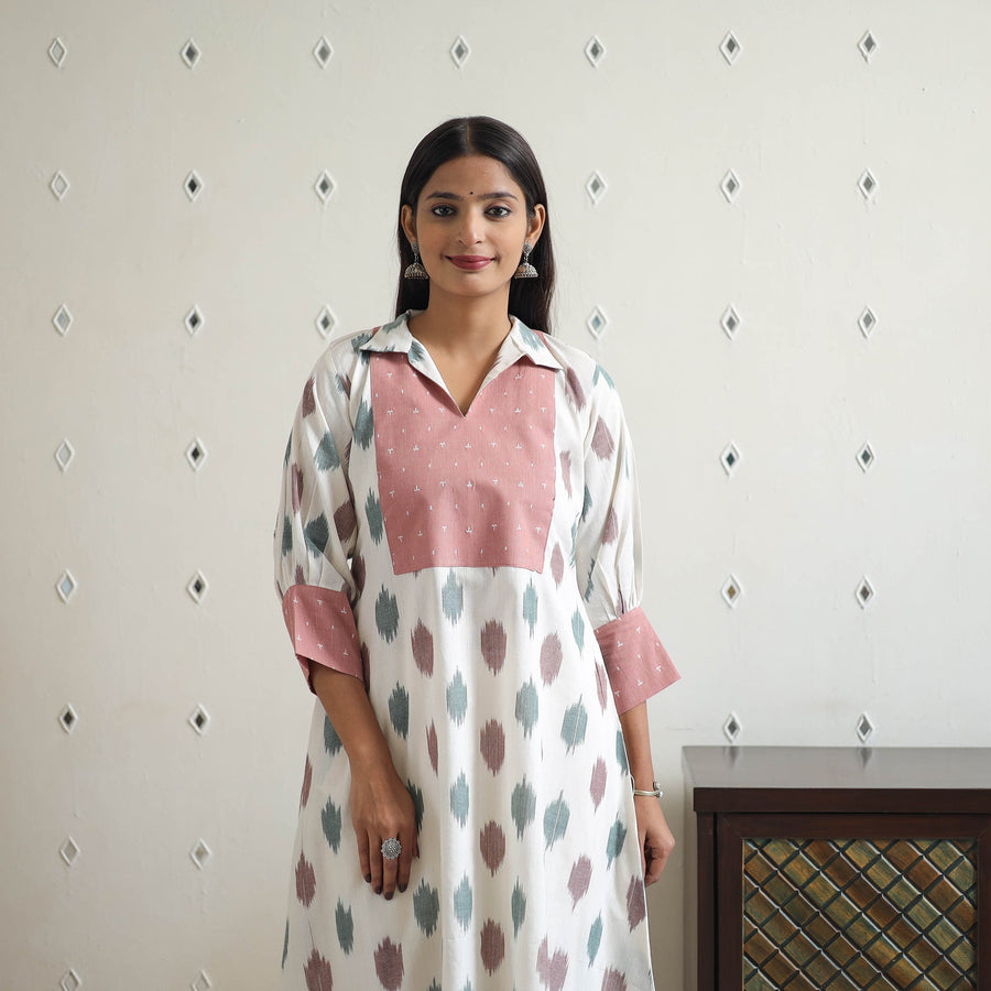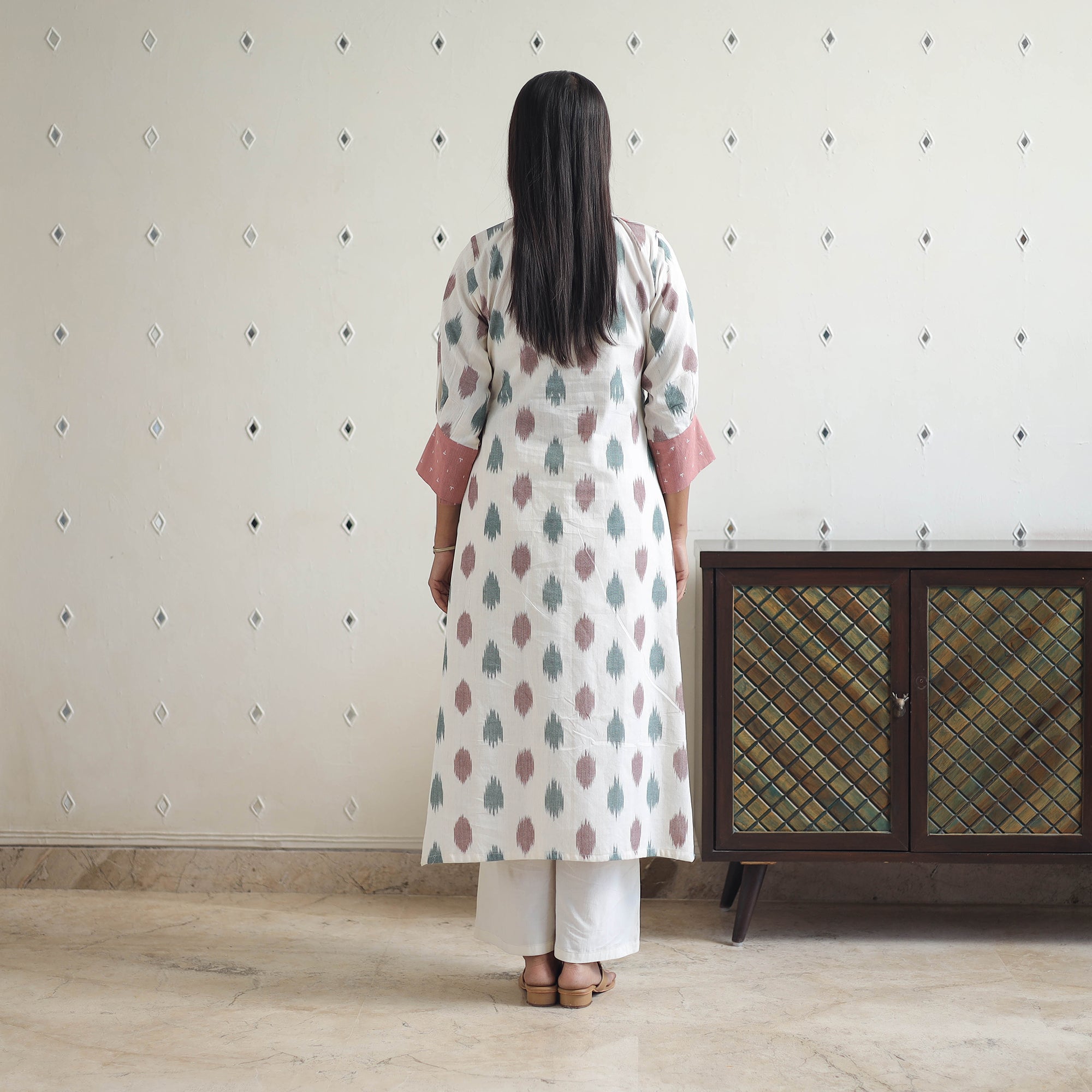 Experience the beauty of Indian ikat with our white cotton a-line pochampally ikat kurta with patchwork. Crafted from breathable cotton, it showcases vibrant patterns created using traditional Ikat techniques. It boasts an exquisite jacquard patchwork design, adding a touch of elegance to your ensemble. Perfect for both casual outings & festive occasions, this kurta reflects the rich heritage of Indian craftsmanship.
