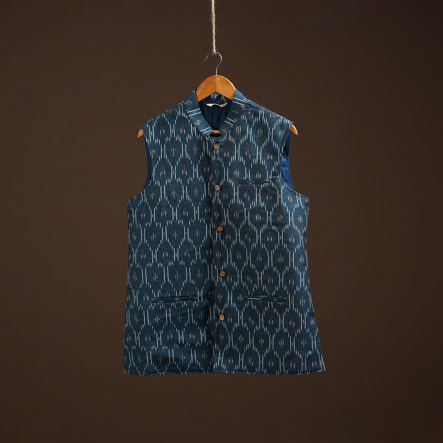 This blue cotton pochampally Ikat nehru jacket is a perfect mix of tradition and style. Designed with a smart chinese collar, sleeveless cut, and three handy outer pockets, it brings comfort with elegance. Pair it with a kurta-pajama for festive looks, wear over a shirt-trouser for semi-formal outings, or style with denim for a trendy casual vibe. This versatile jacket uplifts every occasion effortlessly.