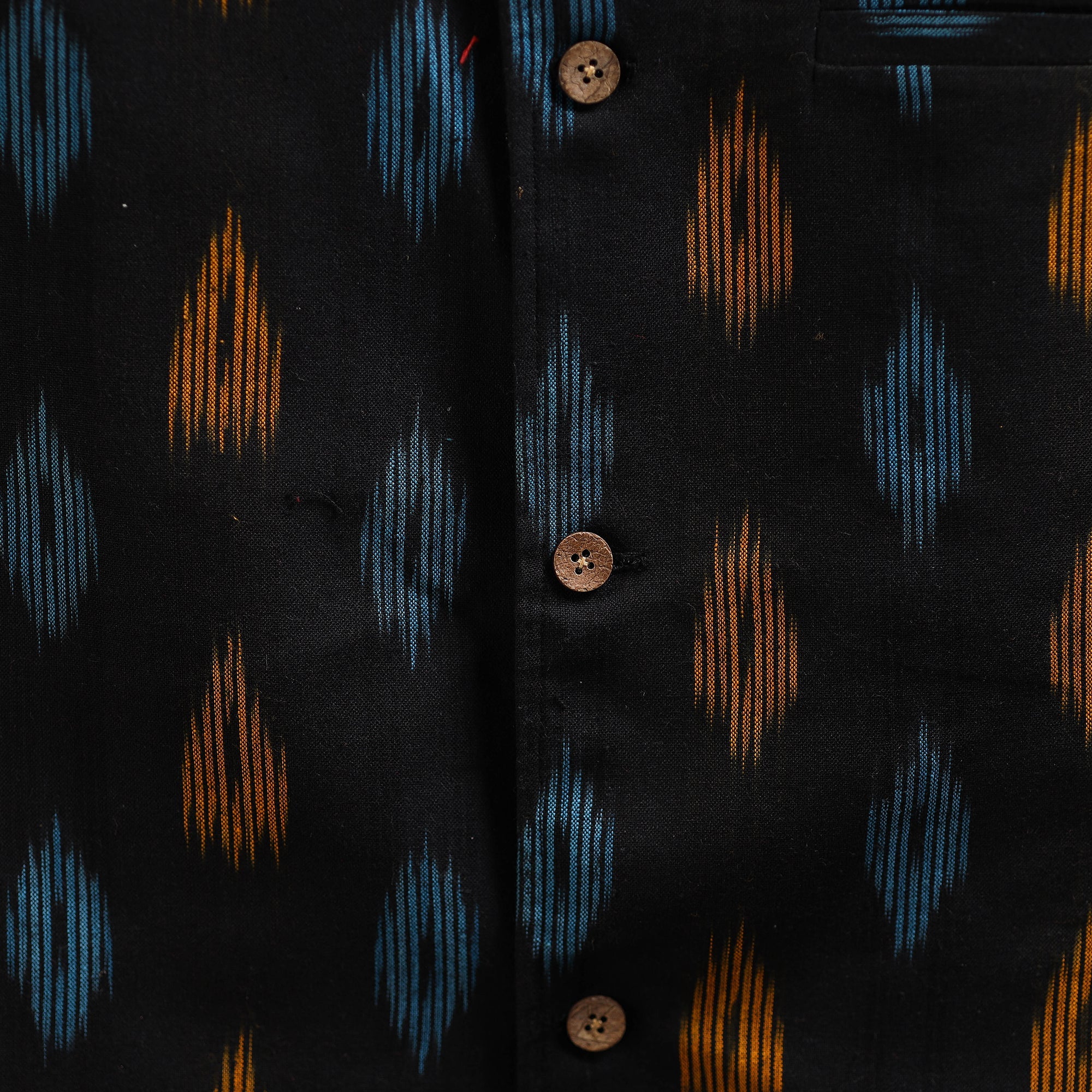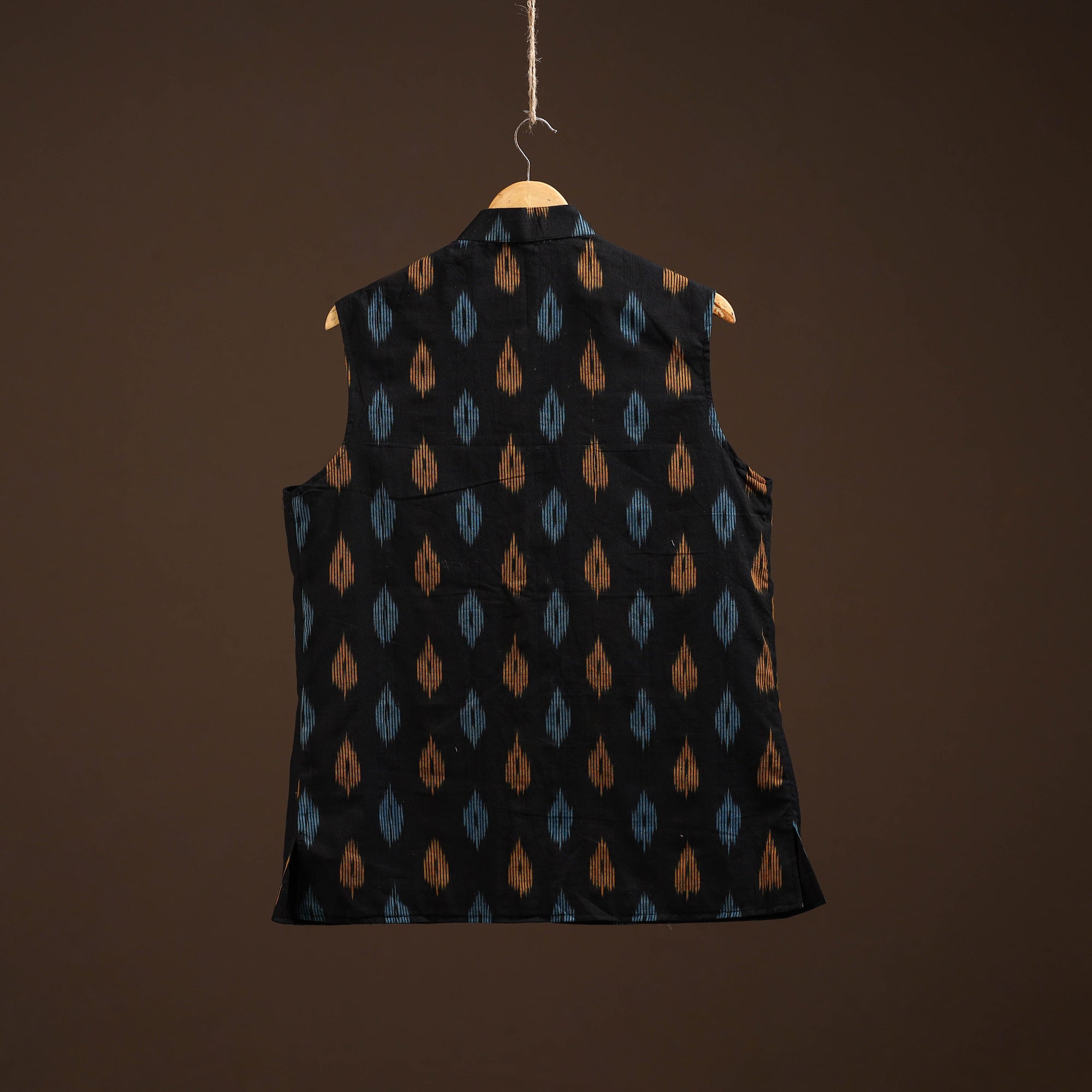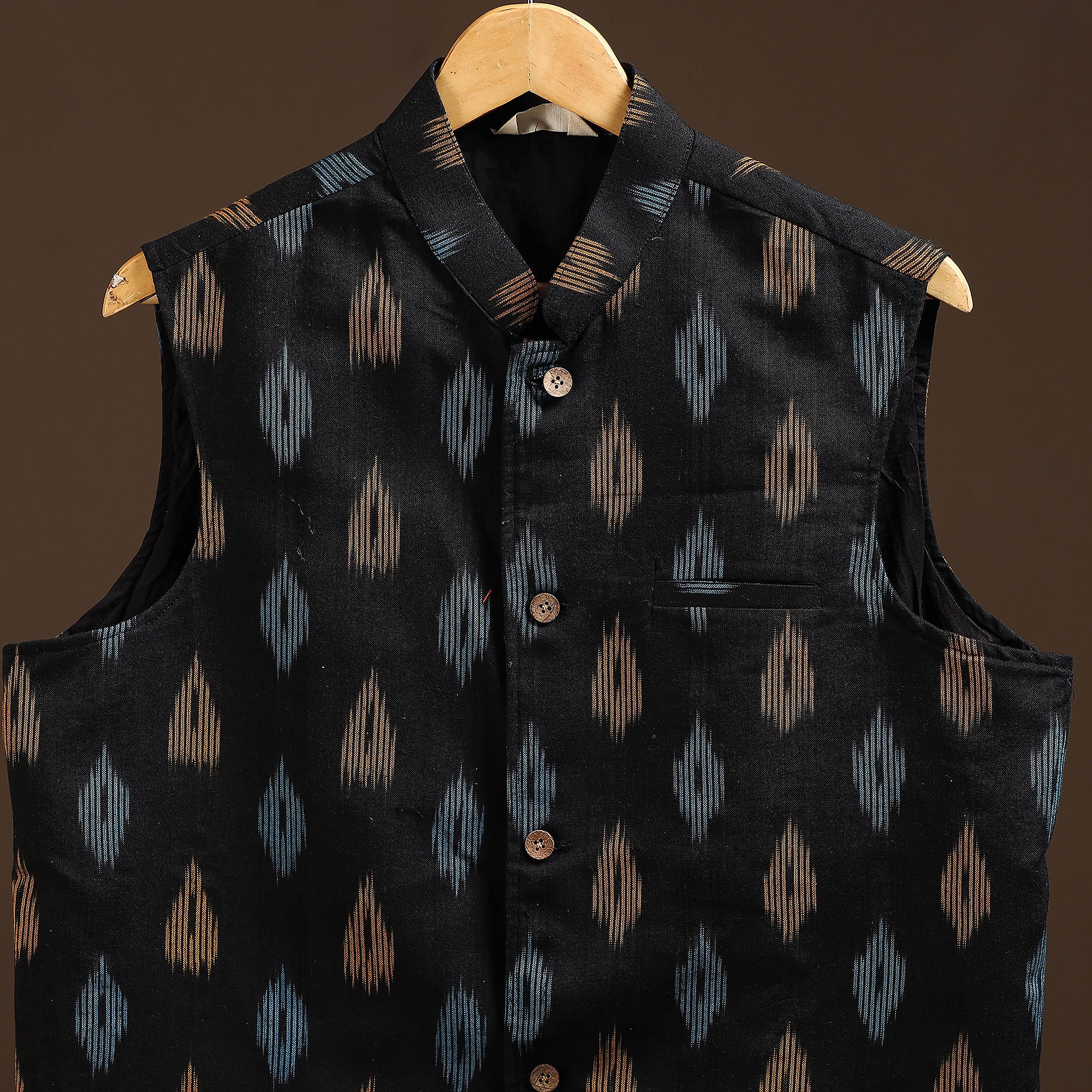 This cotton pochampally Ikat nehru jacket is a perfect mix of tradition and style. Designed with a smart chinese collar, sleeveless cut, and three handy outer pockets, it brings comfort with elegance. Pair it with a kurta-pajama for festive looks, wear over a shirt-trouser for semi-formal outings, or style with denim for a trendy casual vibe. This versatile jacket uplifts every occasion effortlessly.