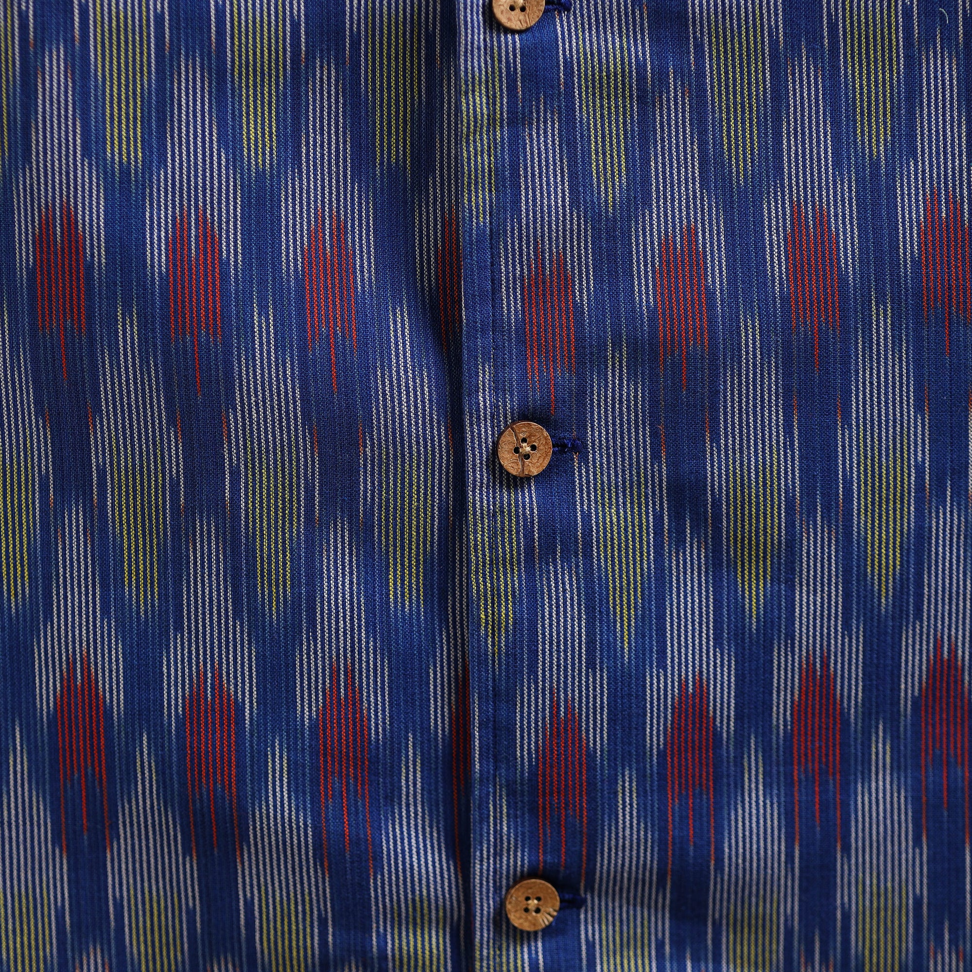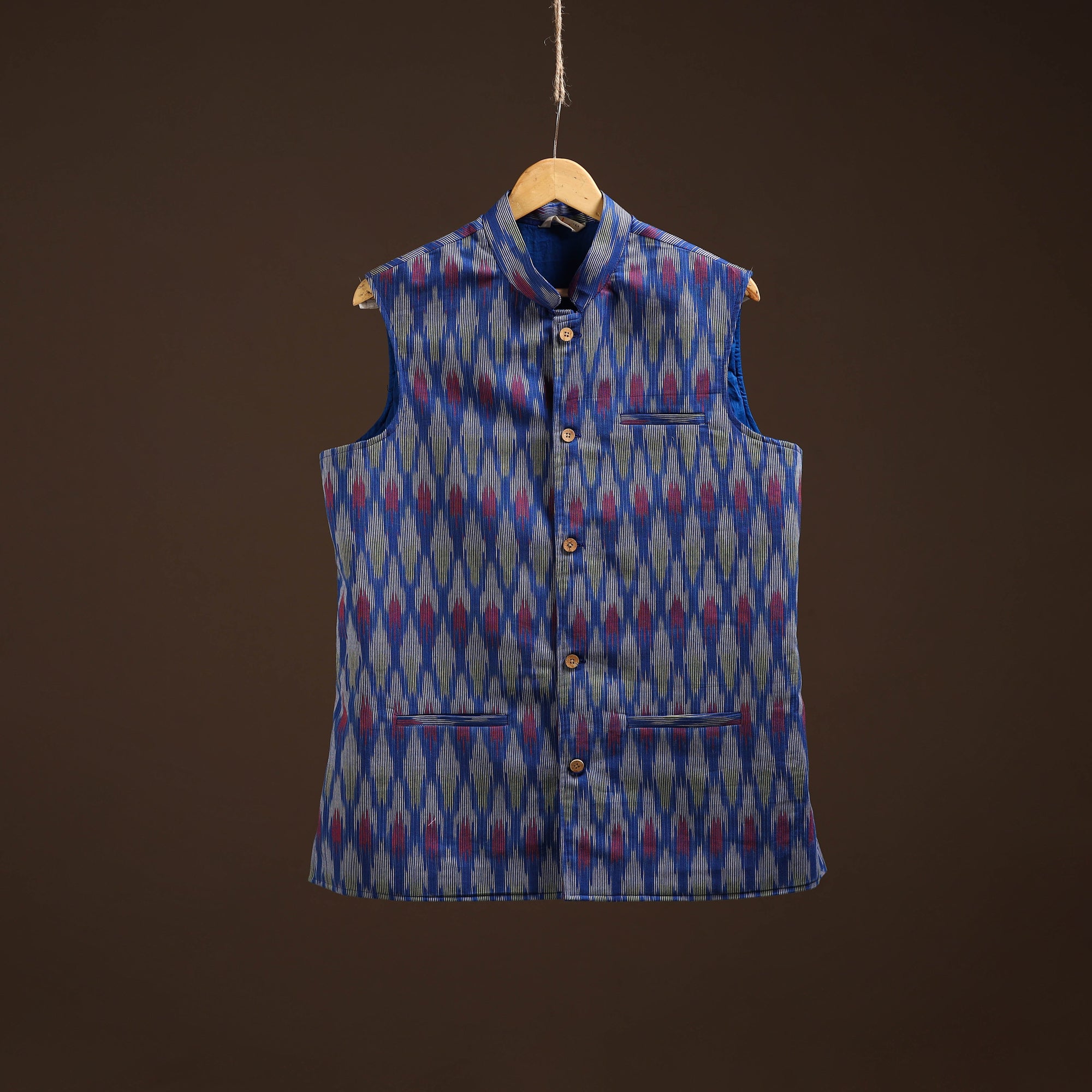 This blue cotton pochampally Ikat nehru jacket is a perfect mix of tradition and style. Designed with a smart chinese collar, sleeveless cut, and three handy outer pockets, it brings comfort with elegance. Pair it with a kurta-pajama for festive looks, wear over a shirt-trouser for semi-formal outings, or style with denim for a trendy casual vibe. This versatile jacket uplifts every occasion effortlessly.