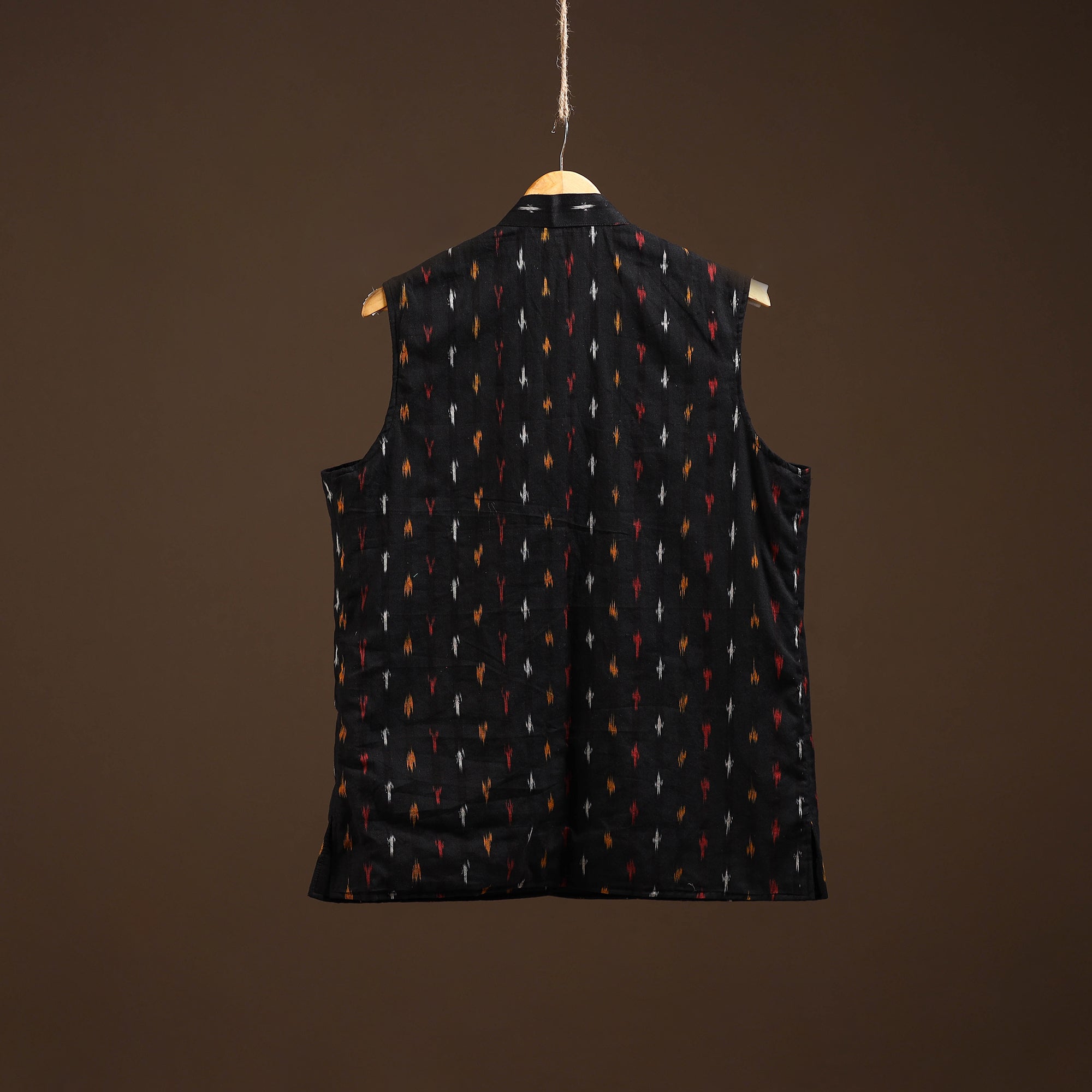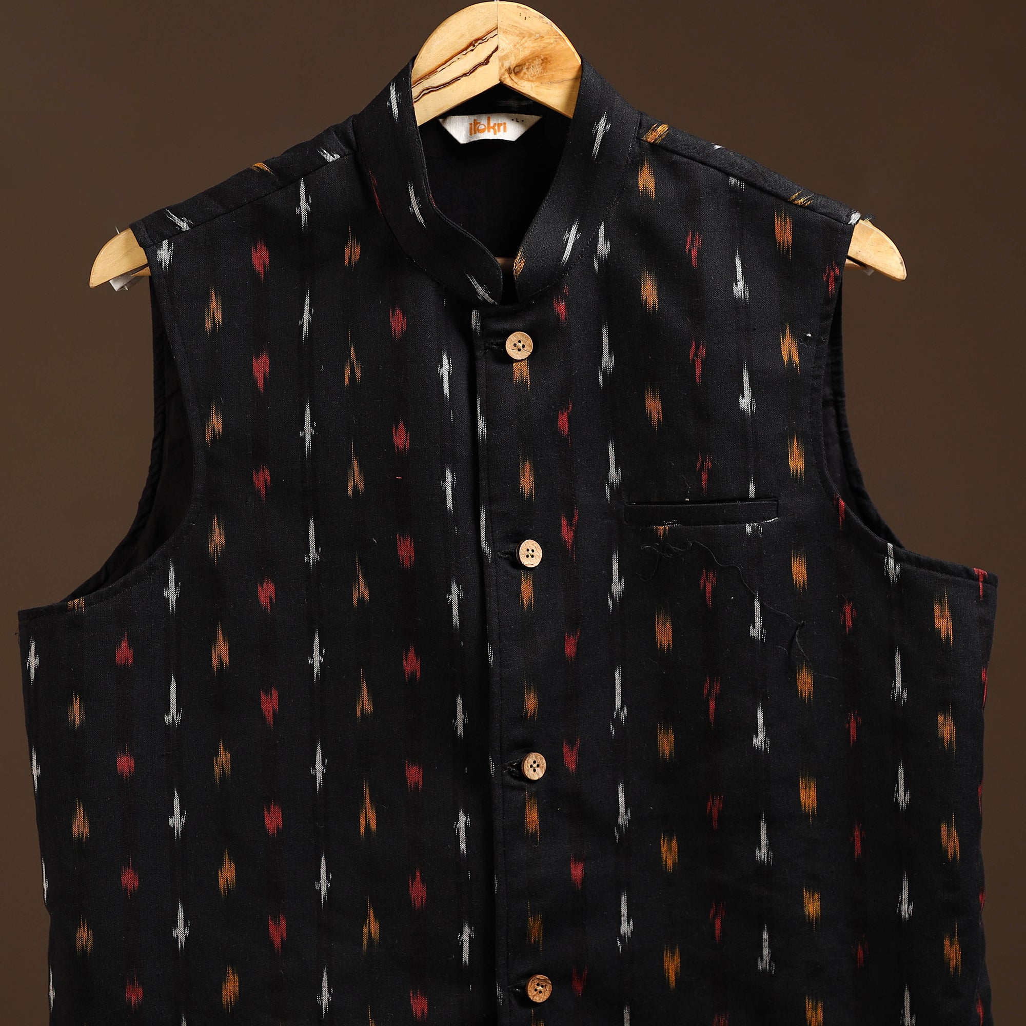 This black cotton pochampally Ikat nehru jacket is a perfect mix of tradition and style. Designed with a smart chinese collar, sleeveless cut, and three handy outer pockets, it brings comfort with elegance. Pair it with a kurta-pajama for festive looks, wear over a shirt-trouser for semi-formal outings, or style with denim for a trendy casual vibe. This versatile jacket uplifts every occasion effortlessly.