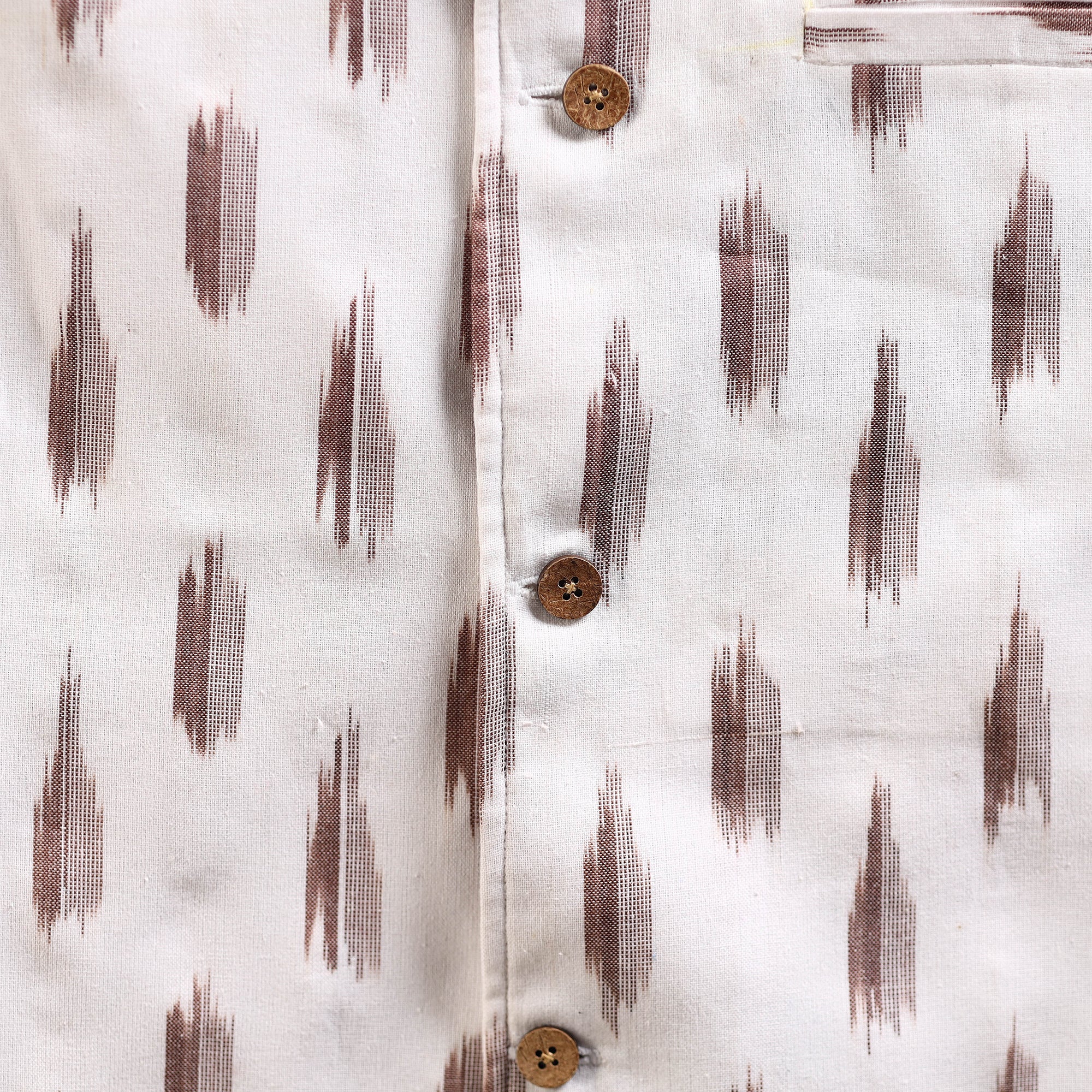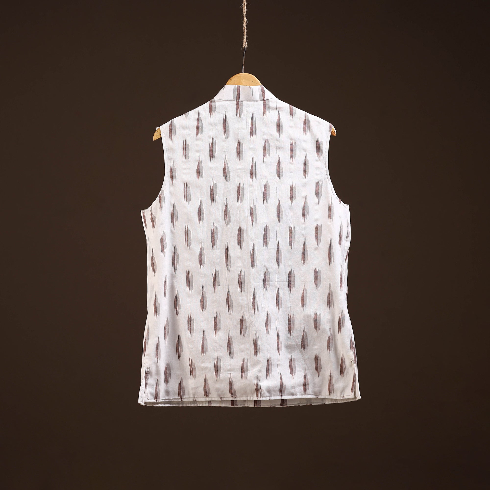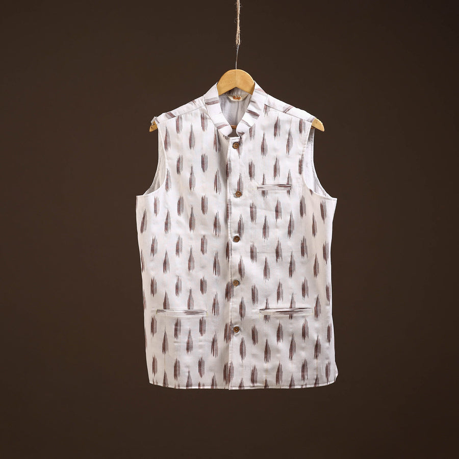 This white cotton pochampally Ikat nehru jacket is a perfect mix of tradition and style. Designed with a smart chinese collar, sleeveless cut, and three handy outer pockets, it brings comfort with elegance. Pair it with a kurta-pajama for festive looks, wear over a shirt-trouser for semi-formal outings, or style with denim for a trendy casual vibe. This versatile jacket uplifts every occasion effortlessly.