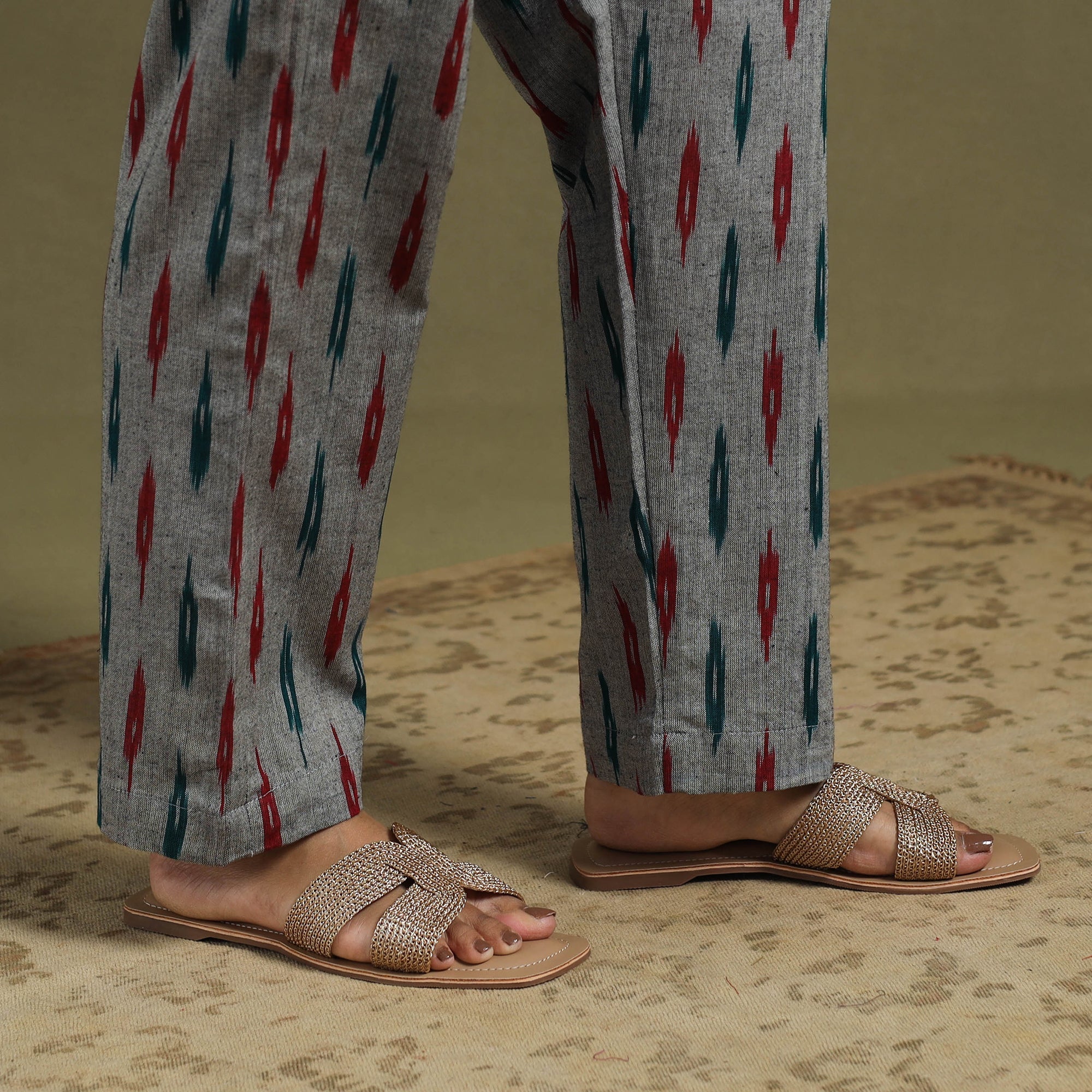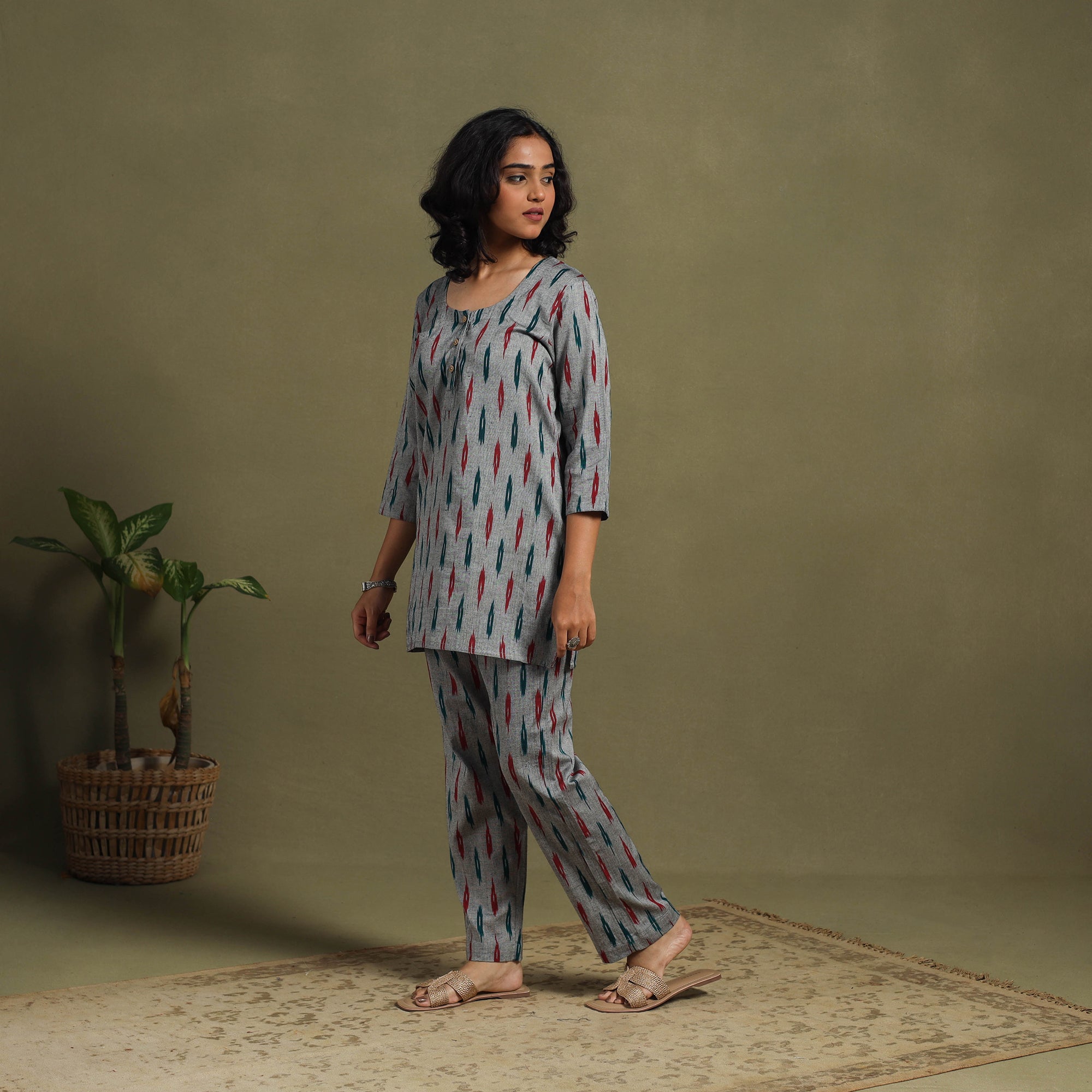 This grey cotton pochampally Ikat night suit set, crafted from breathable cotton, blends comfort with artisanal elegance. It features a relaxed-fit top and matching pants with an elasticated waist and two side pockets. Designed thoughtfully for cozy evenings and restful nights, it brings traditional charm into your everyday routine with effortless style.