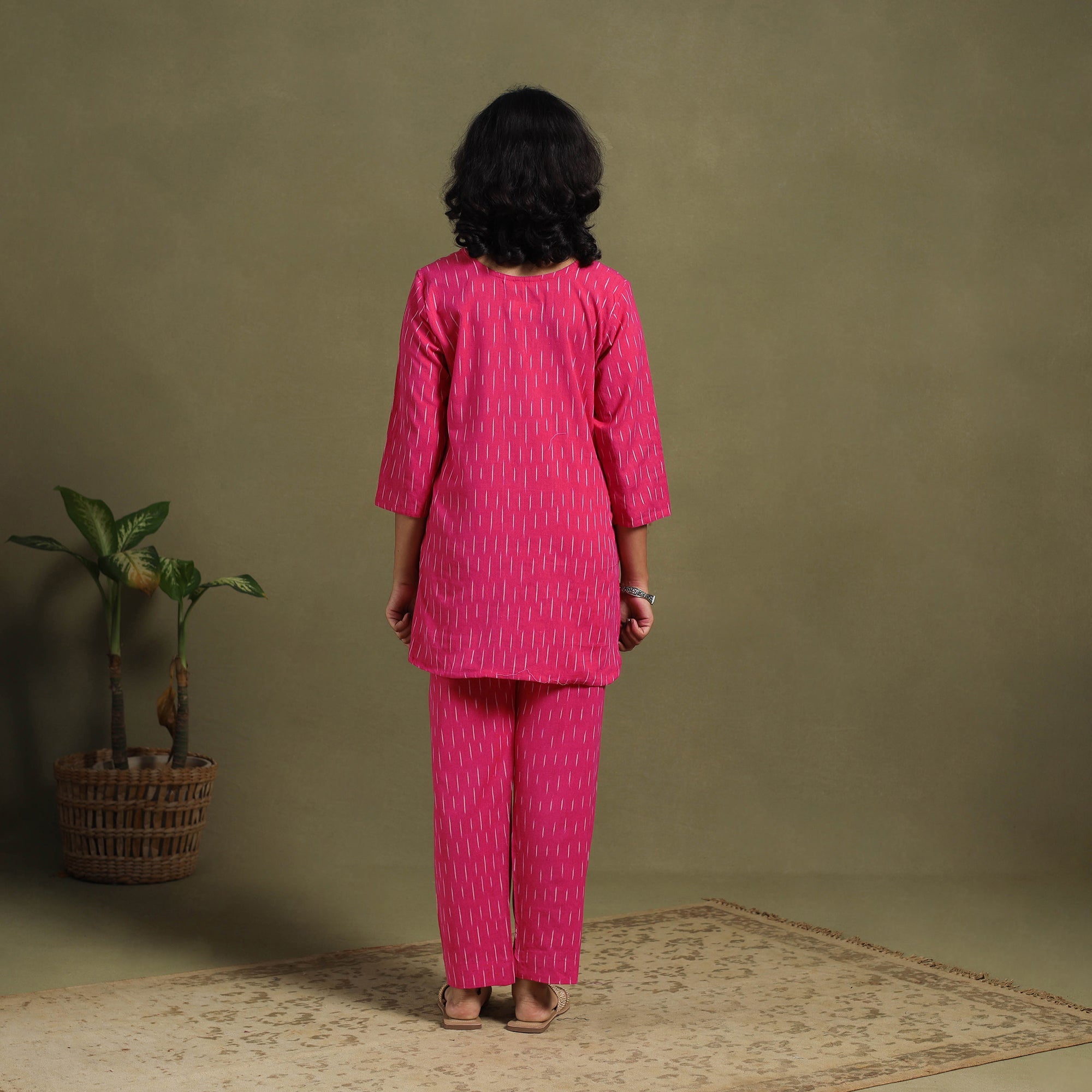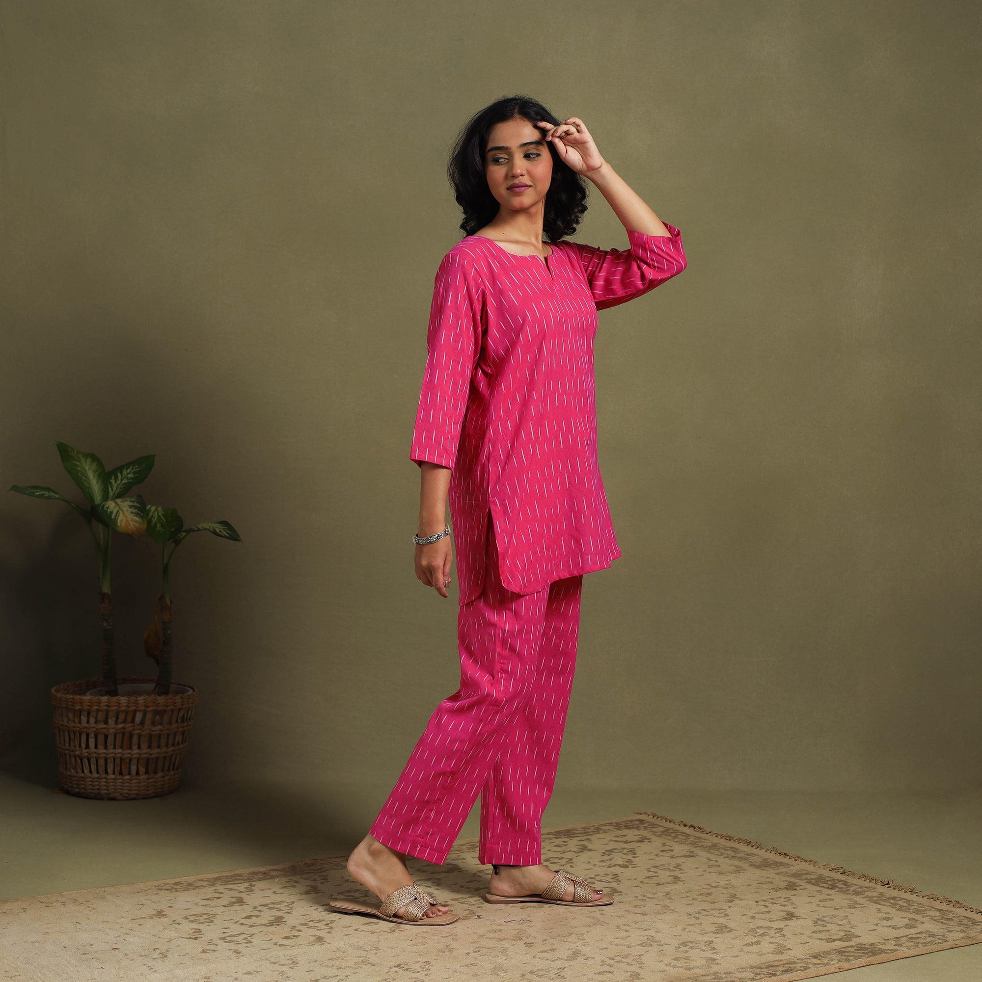 This pink cotton pochampally Ikat night suit set, crafted from breathable cotton, blends comfort with artisanal elegance. It features a relaxed-fit top and matching pants with an elasticated waist and two side pockets. Designed thoughtfully for cozy evenings and restful nights, it brings traditional charm into your everyday routine with effortless style.