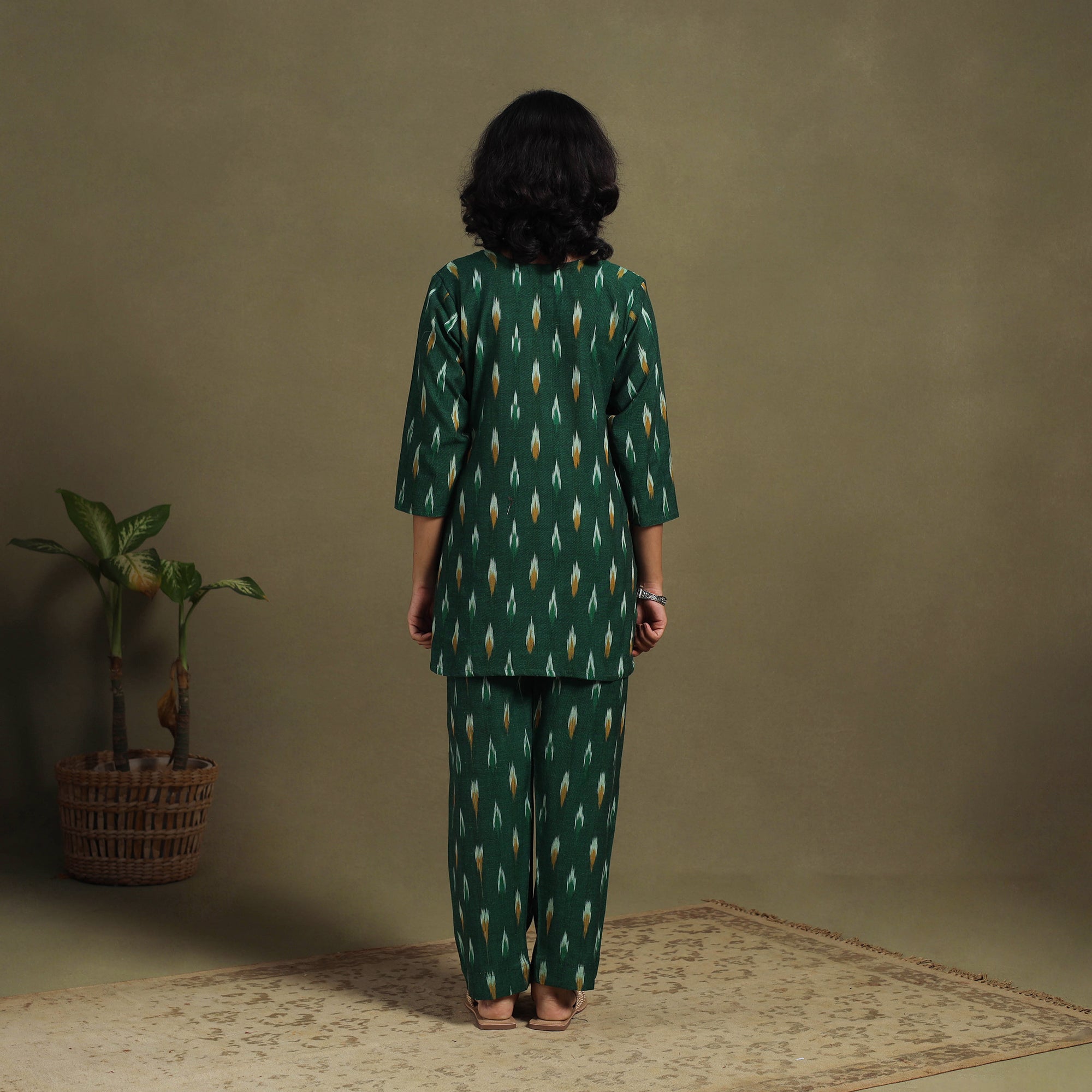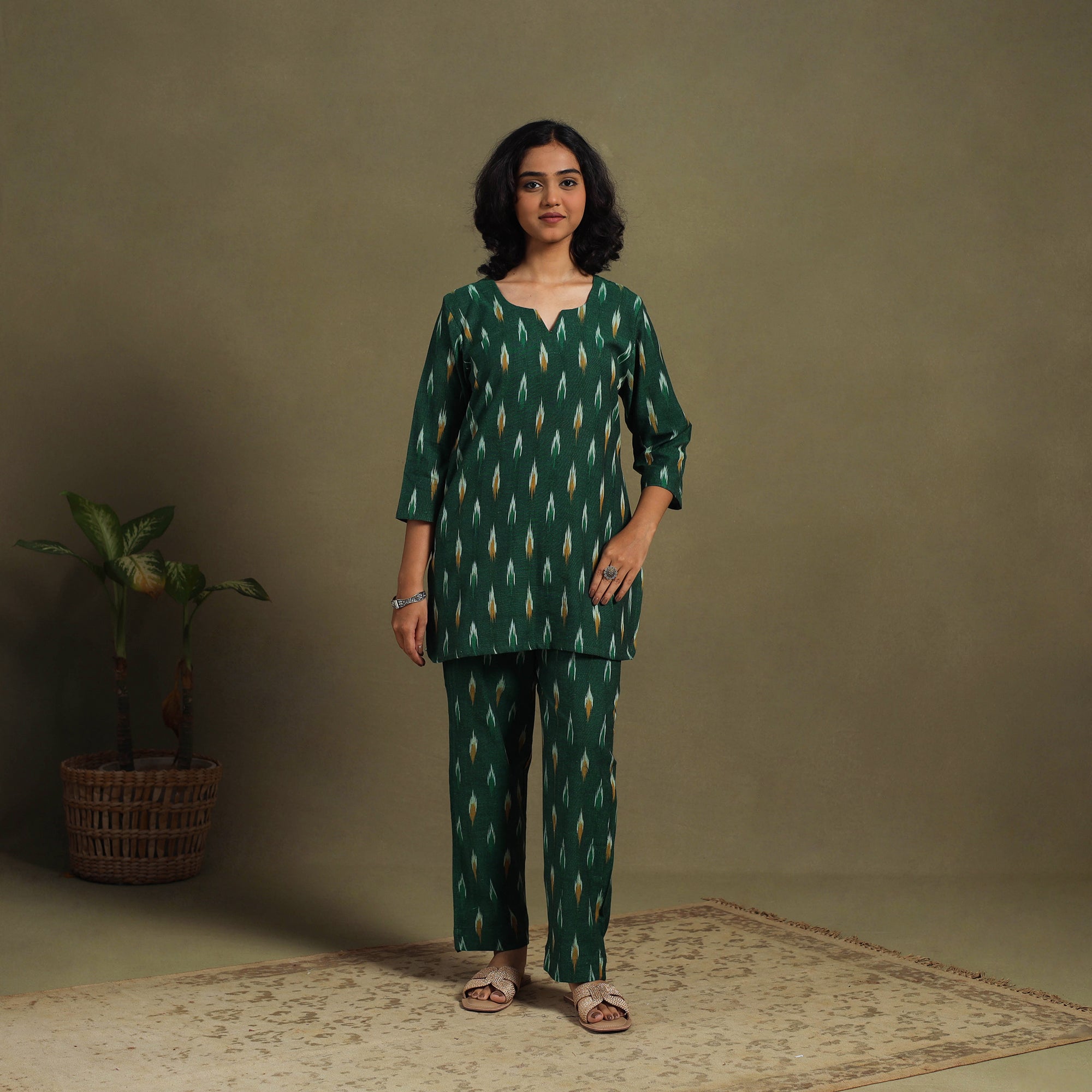 This green cotton pochampally Ikat night suit set, crafted from breathable cotton, blends comfort with artisanal elegance. It features a relaxed-fit top and matching pants with an elasticated waist and two side pockets. Designed thoughtfully for cozy evenings and restful nights, it brings traditional charm into your everyday routine with effortless style.