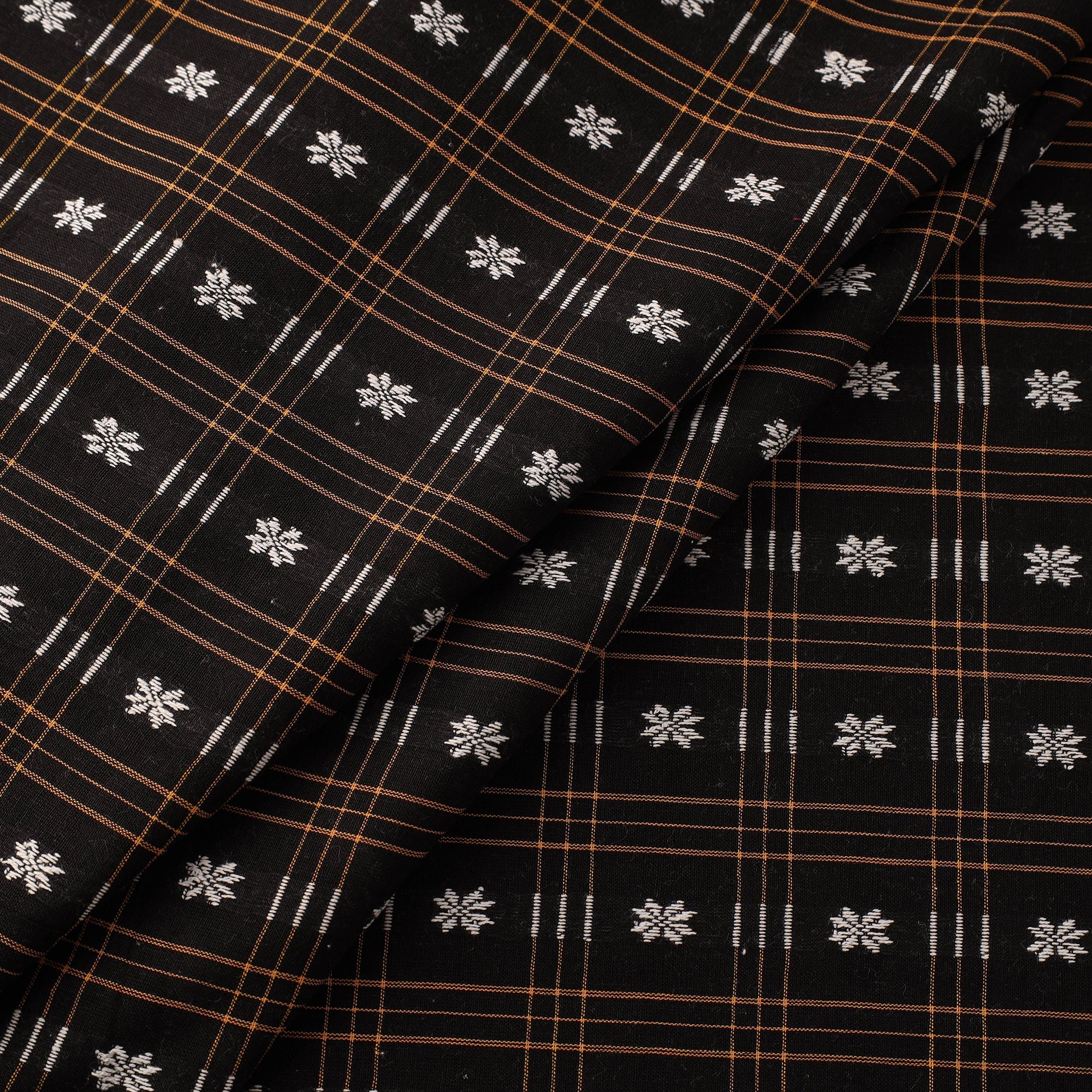 Black sambalpuri ikat cotton fabric, originating from Odisha, features traditional motifs such as shankha, chakra and phula. Rooted in a weaving tradition that is over 900 years old, it is crafted using the traditional ikat technique where yarns are dyed before weaving. This breathable cotton is easy to stitch and perfect for kurtas, dresses and home decor projects.