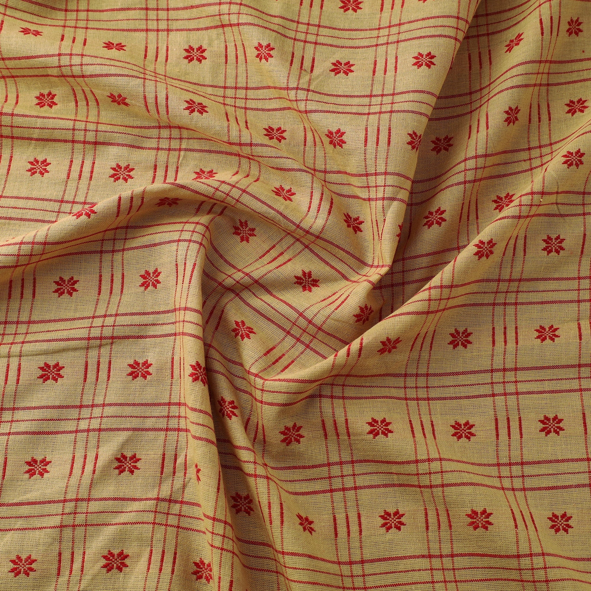 Beige sambalpuri ikat cotton fabric, originating from Odisha, features traditional motifs such as shankha, chakra and phula. Rooted in a weaving tradition that is over 900 years old, it is crafted using the traditional ikat technique where yarns are dyed before weaving. This breathable cotton is easy to stitch and perfect for kurtas, dresses and home decor projects.