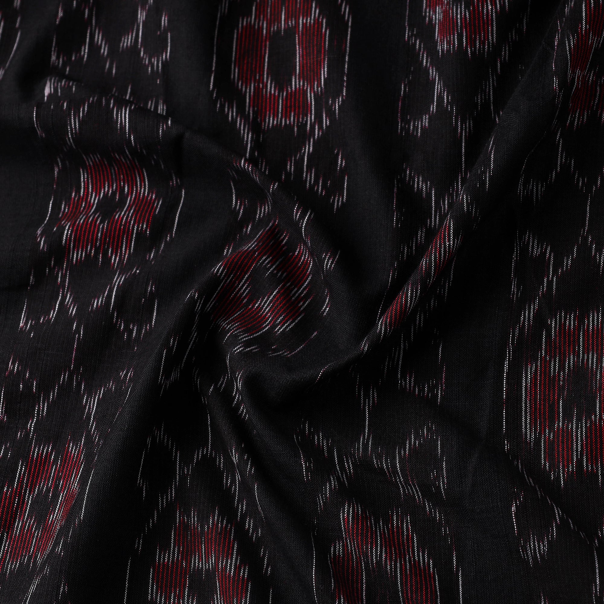 Black sambalpuri Ikat cotton fabric from Odisha features traditional motifs like shankha, chakra, and phula. Crafted by skilled artisans of eastern India using the Ikat technique, where threads are resist-dyed before weaving. This breathable fabric is easy to stitch, making it perfect for kurtas, dresses, or home decor.